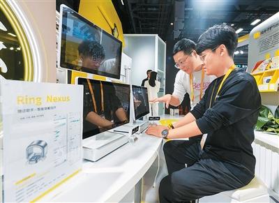 近年来,中国互联网产业发展迅速。图为第八届进博会医疗器械及医药保健展区的美团医药健康展台,参观者体验AI中医四诊合参仪。翁奇羽摄(人民视觉)