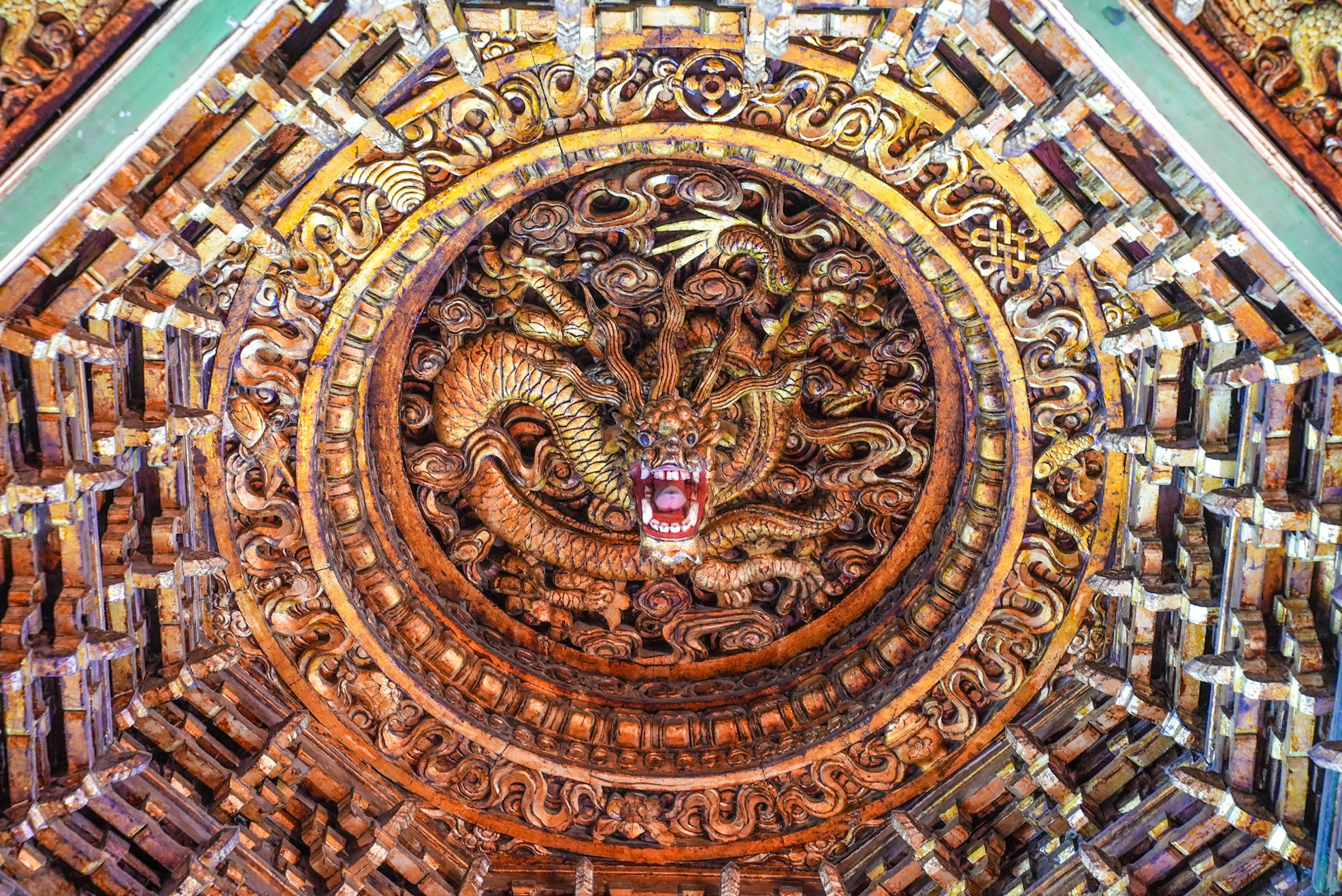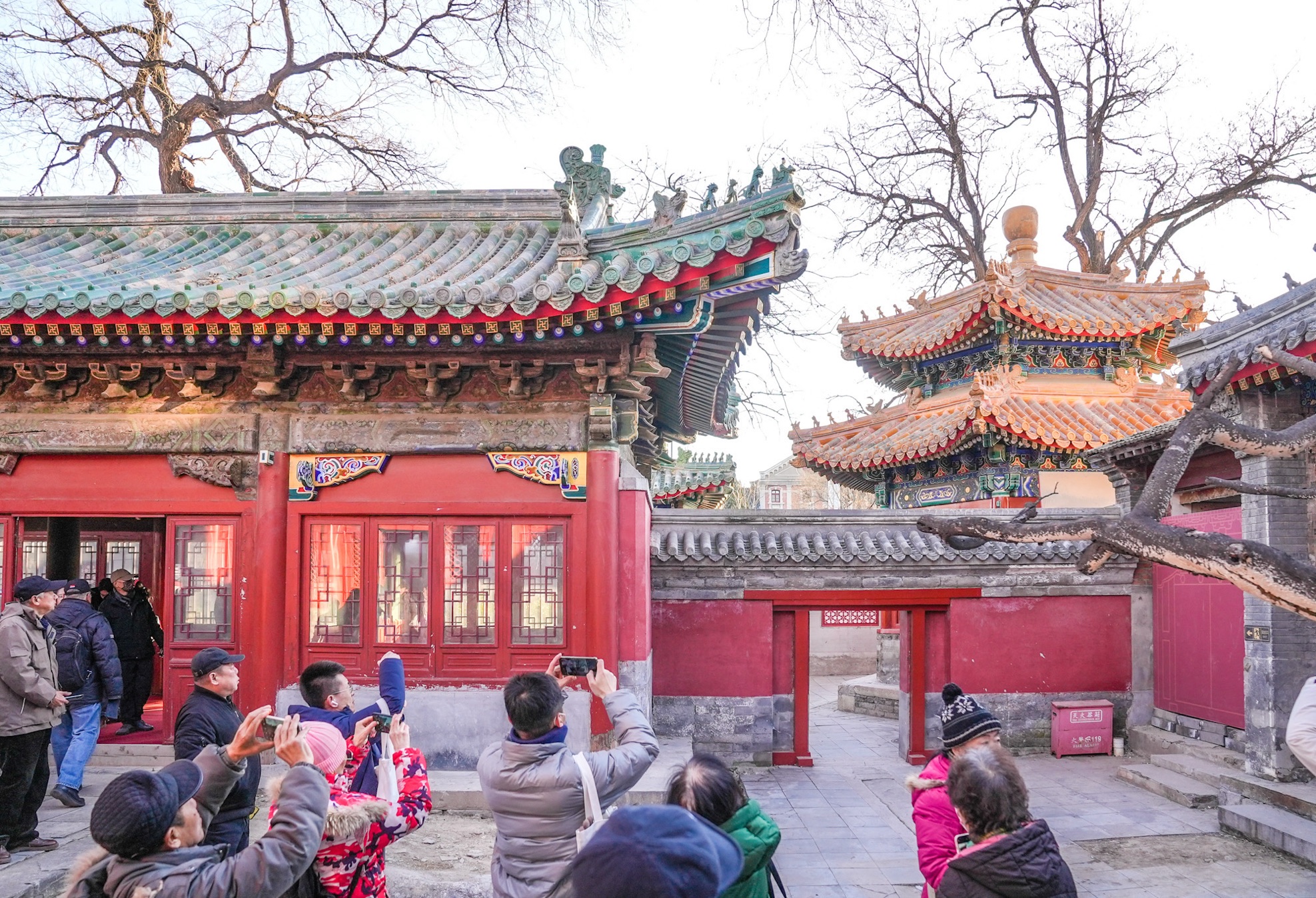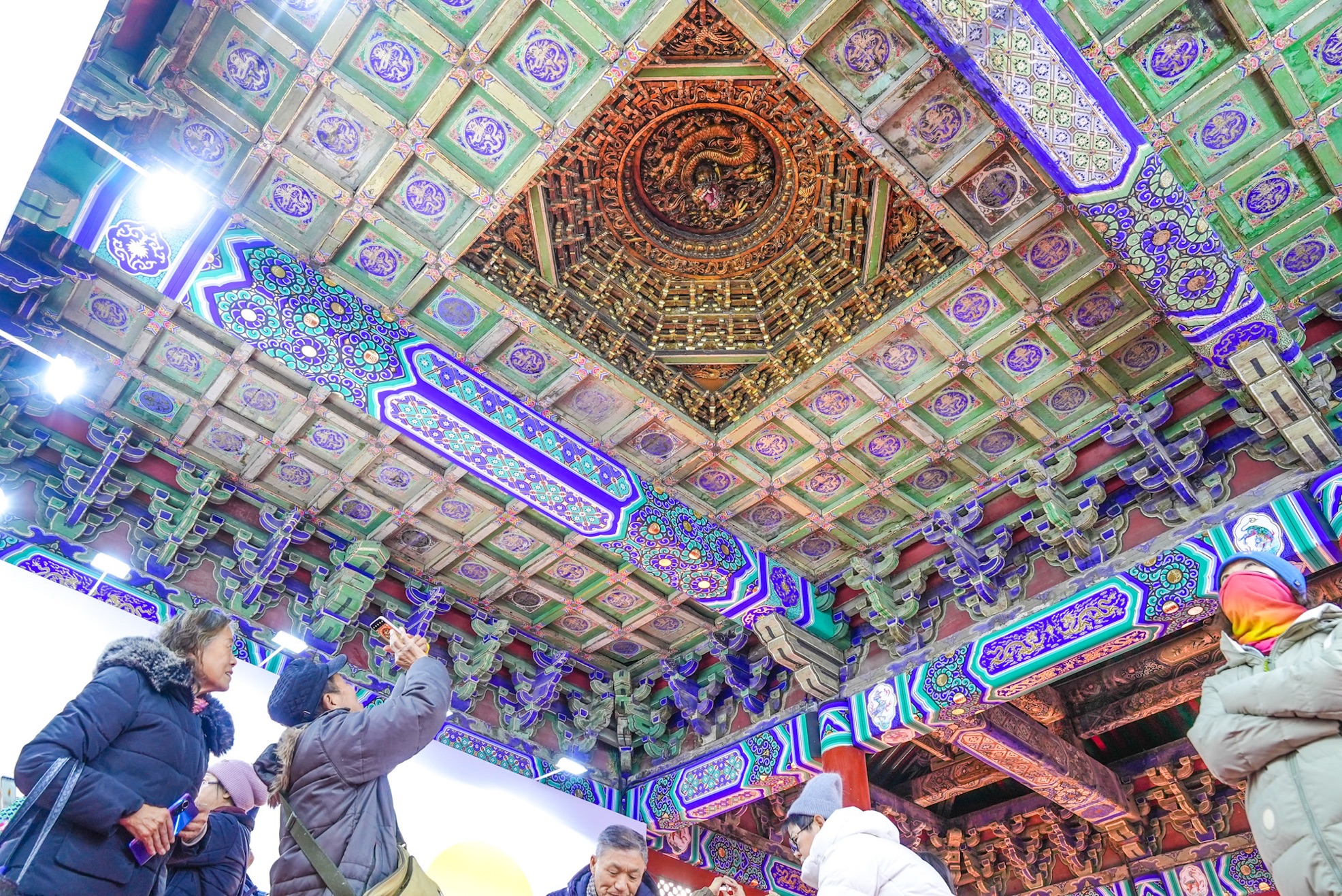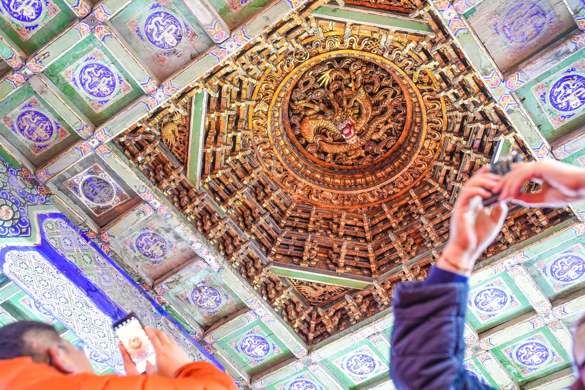 正殿内的盘龙纹饰藻井尤为精美,吸引众多参观者留影。藻井中心盘踞着雕刻精美的盘龙,龙身鳞片纹理细腻,搭配周边“佛八宝”吉祥纹饰,彰显皇家祭祀场所的威严,尽显古代工匠的精巧匠心。