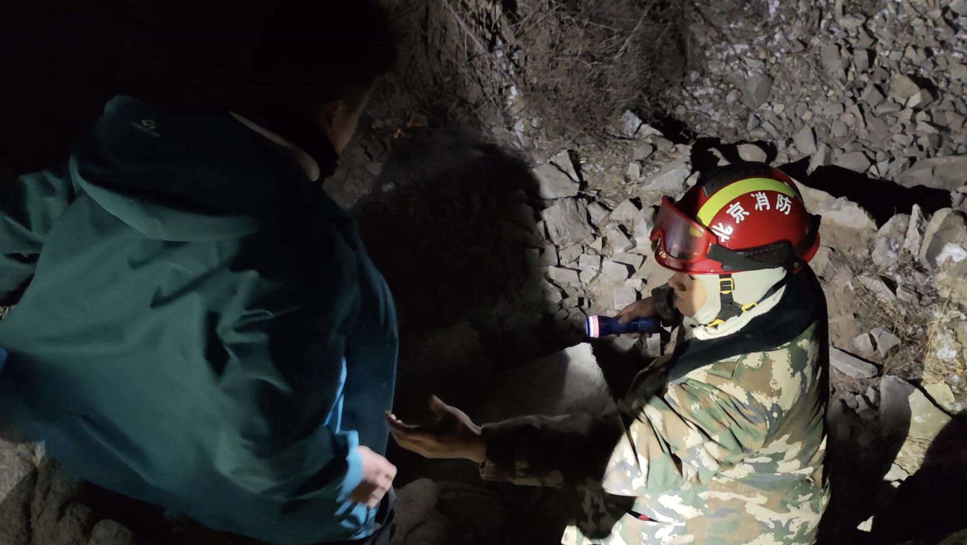 16时,消防救援人员抵达山下集结点,与斋堂镇政府工作人员、派出所民警及报警人会合,共同研判搜救路线。