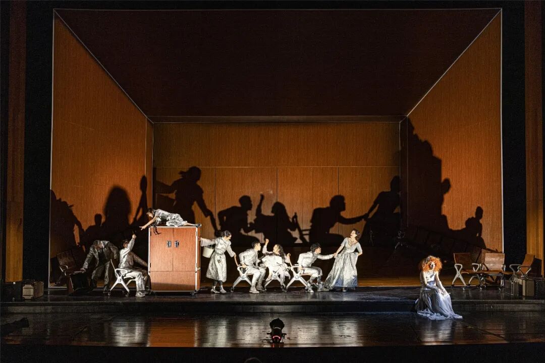 木质纹理的框体覆盖整个舞台,倾斜的坡面延伸向乐池,来自格鲁吉亚新剧院团队的舞美设计让看似简约的舞台布景暗藏玄机。光影交织下,舞台空间的纵深得到了充分的运用,道具的排列组合形成了不同景观,《樱桃园》的文本在这样的设计理念下变得活灵活现,掩藏于原作中的诸多线索也得到了清晰的展示。