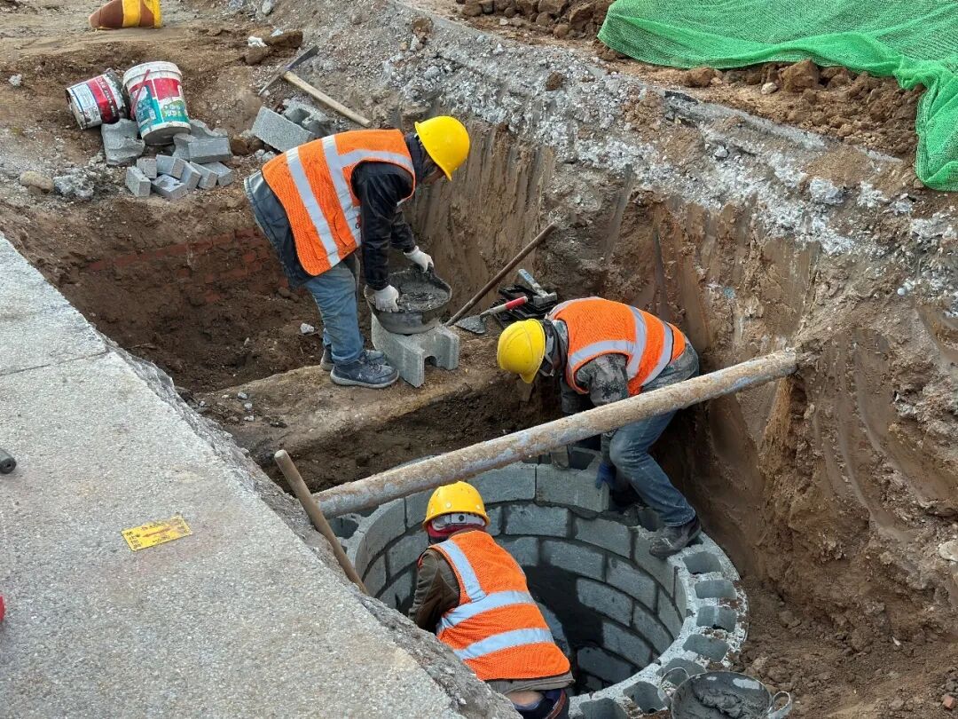 工人正在砌筑检查井,便于日后维修管道(记者韩雪莹 摄)