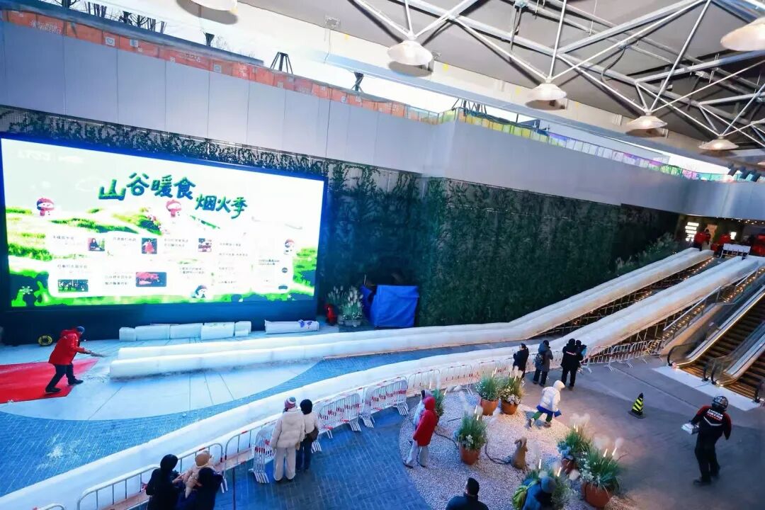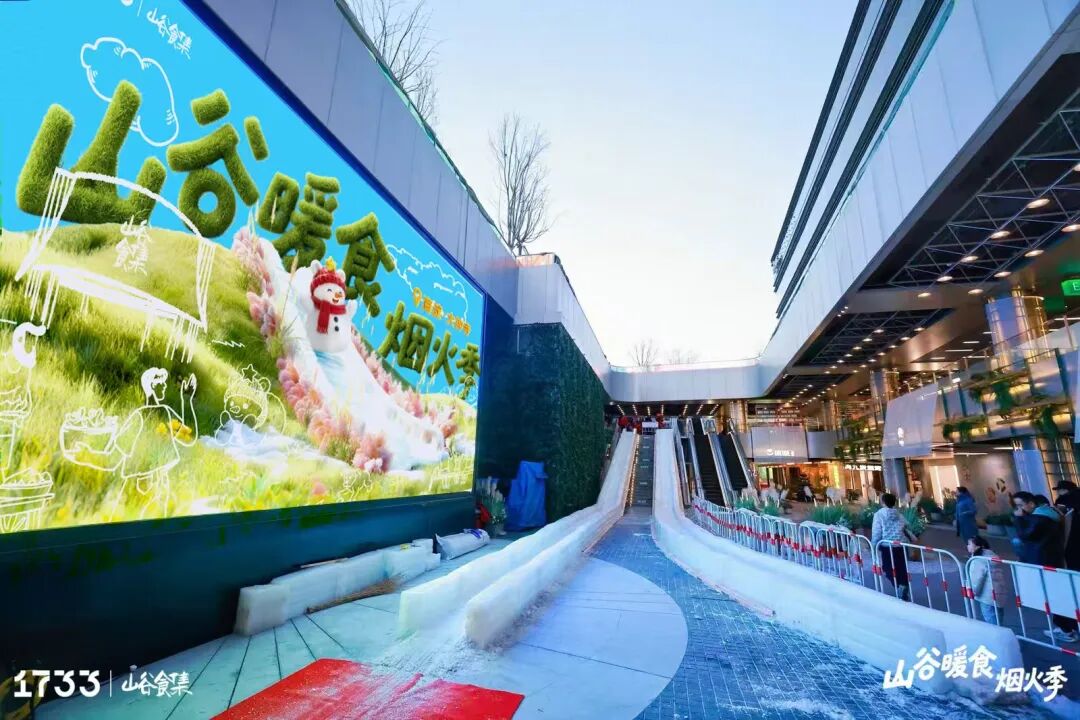 冰滑梯所在的1733山谷食集,本就是北京一处独特的消费生活空间。以“自然生态+街店游逛”的创新模式,为市民打造了一个集美食、社交与自然体验于一体的全新空间。这里既有木质材料与绿植的相得益彰,也有美食市集与文化活动的迭奏。
