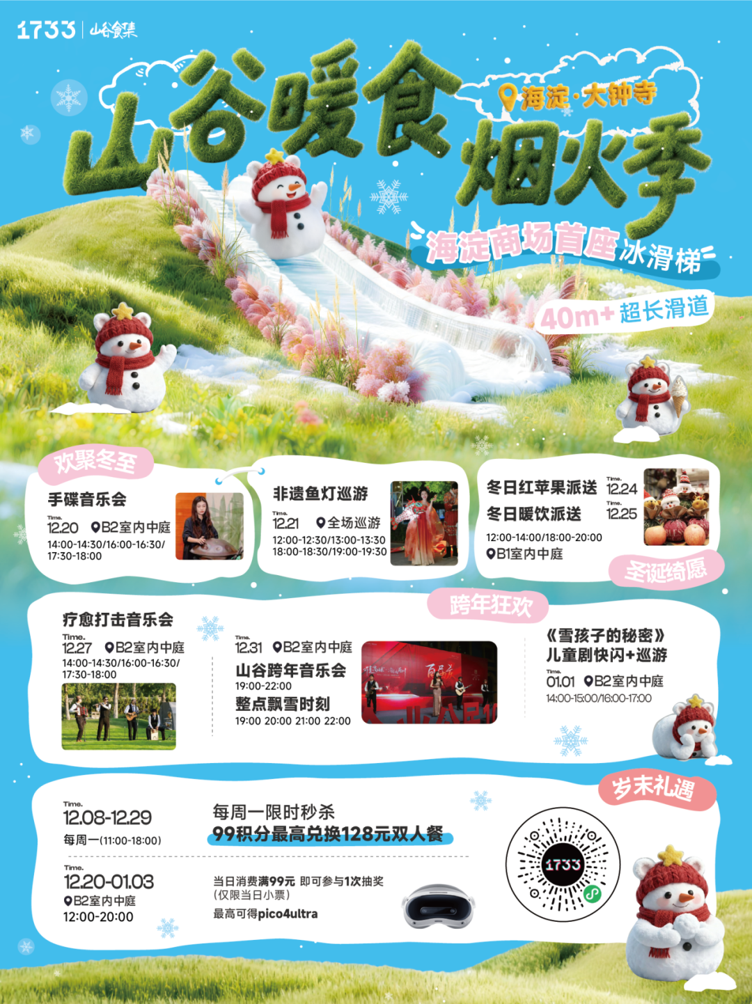 滑完冰梯,你可以在街区里继续漫步:去热气腾腾的小店吃一份暖食,在精心设计的角落拍下冬日写真,或者简单的享受这种“在谷中游逛”的松弛感。冰滑梯不止是一个游乐项目,更是你深入体验1733山谷食集氛围的趣味入口。