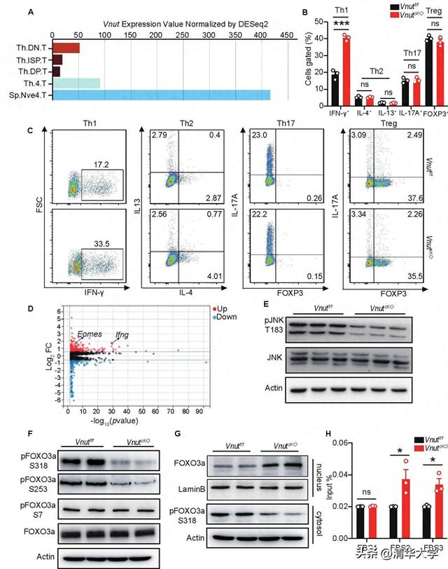 研究团队首先发现VNUT在CD4⁺T细胞发育成熟后,其表达量呈显著上调趋势(图1A)。为探究VNUT在CD4⁺T细胞分化中的功能,研究团队利用loxp-cre条件性敲除技术,构建了CD4⁺T细胞特异性Vnut基因敲除(cKO)小鼠模型。体外诱导分化实验结果显示,与野生型相比,cKO小鼠来源的CD4⁺T细胞向Th1亚型的分化能力显著增强,具体表现为Th1细胞比例升高及特征细胞因子IFN-g表达上调(图1B、C)。为解析上述表型的分子机制,研究团队对cKO小鼠来源的Th1细胞进行RNA-seq分析,发现转录因子Eomes的mRNA水平均显著升高(图1D)。进一步的机制探究表明,VNUT通过调控CD4⁺T细胞受体(TCR)刺激后的ATP释放,进而影响ATP受体P2X7R的活化状态;而P2X7R的活化差异会进一步传导至下游信号通路,调控JNK激酶的磷酸化水平(图1E)。后续实验证实,磷酸化的JNK可直接作用于转录因子FOXO3a,通过磷酸化修饰调控其核质穿梭及亚细胞定位(图1F、G),进而影响FOXO3a对Eomes基因的转录调控活性(图1H)。最终,通过这一“VNUT-ATP-P2X7R-JNK-FOXO3a-Eomes”的级联调控通路,VNUT实现了对CD4⁺T细胞向Th1亚型分化过程的调控。
