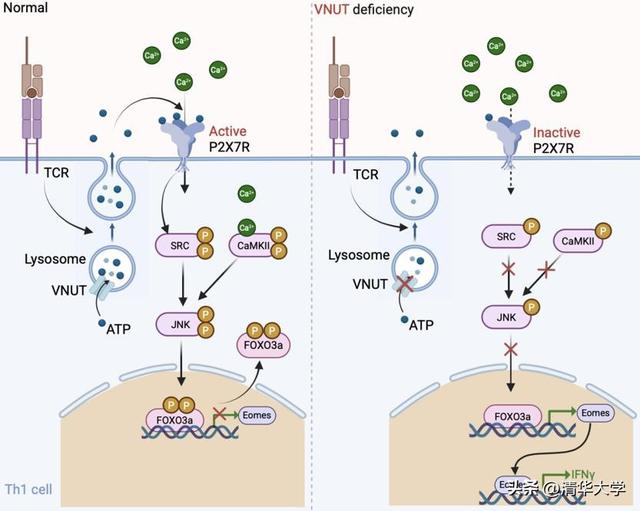 近日,清华大学药学院陈立功课题组及其合作者报道了ATP转运蛋白VNUT通过调控P2X7R-JNK-FOXO3a-Eomes信号通路对Th1细胞的分化产生的调控作用。