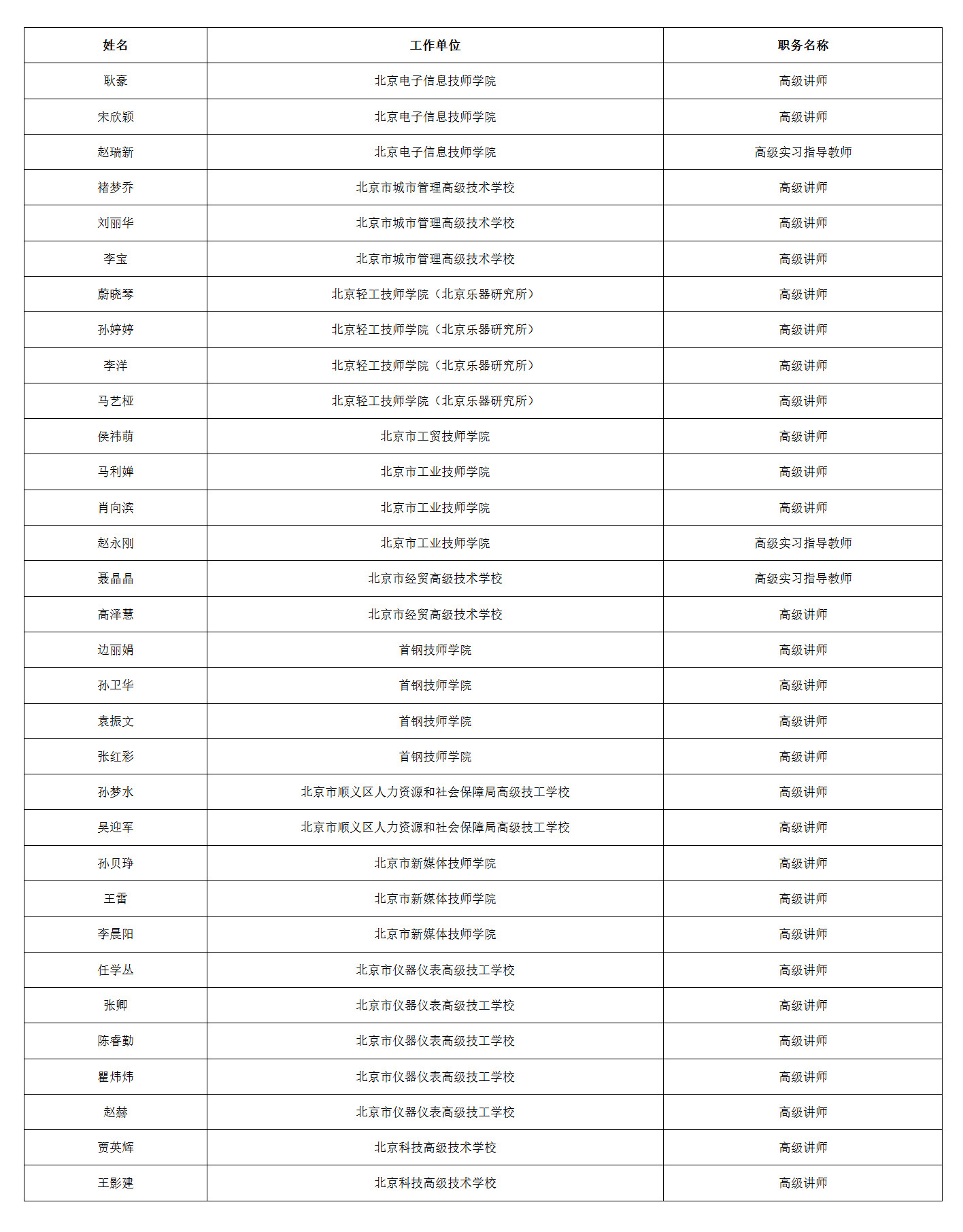 北京市技工院校教师系列高级专业技术职务评审委员会于2025年11月30日召开会议,耿豪等32人(名单附后)通过了高级专业技术职务任职资格评审。根据《北京市职称评审管理暂行办法》(京人社事业发〔2020〕12号)的规定,经复核,现予以公示。