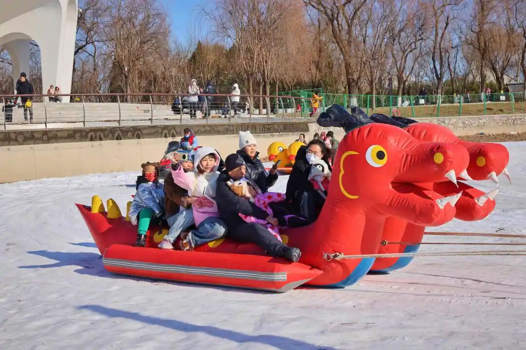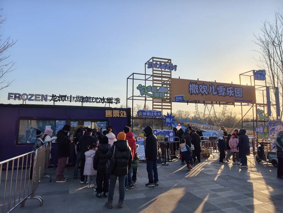 从龙潭中湖公园北门步入园内,一抬头便能看见“撒欢儿雪乐园”售票处排起了长队。