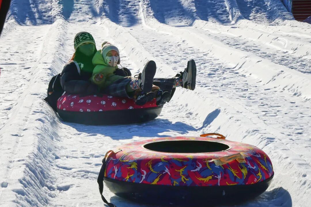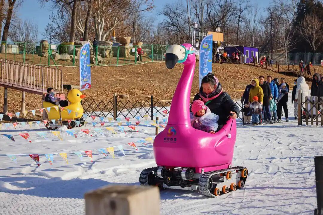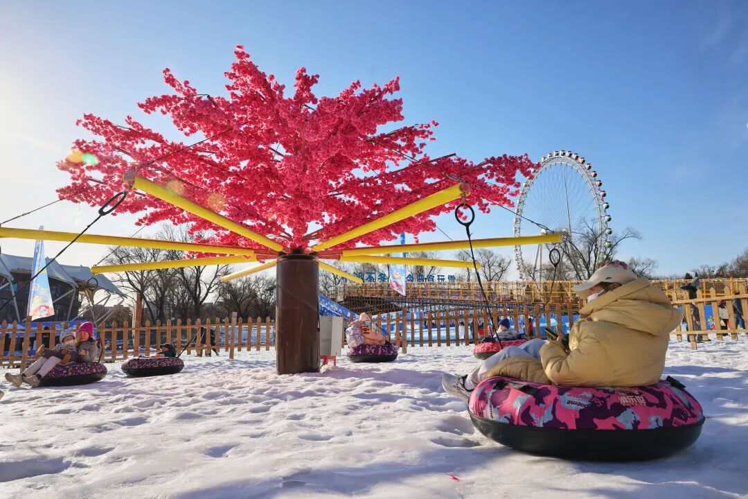 百余米长的雪圈大滑梯上,市民游客乘彩色雪圈飞驰而下;不远处的“雪地摩托火烈鸟”赛道上,家长抱着孩子驾驶萌趣造型的摩托快乐前行;在网红樱花树雪地转转区,雪圈化作“躺椅”,孩子们坐在上面体验飞一般的感觉。