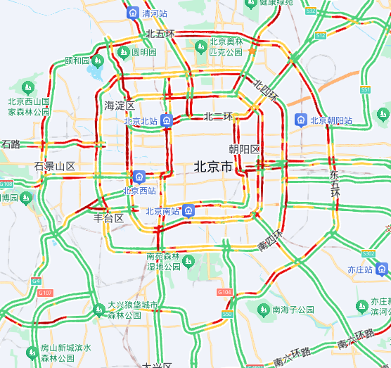 城区东部、西部、北部主要环路部分路段,京藏、京承、京开、京港澳、京新、京通快速等高速公路出京方向部分路段,阜石路、万泉河路、圆明园西路、菜户营南路、丰体南路、通惠河北路等道路局部路段出城方向车流集中。航天桥、CBD、月坛等区域交通压力相对较大。