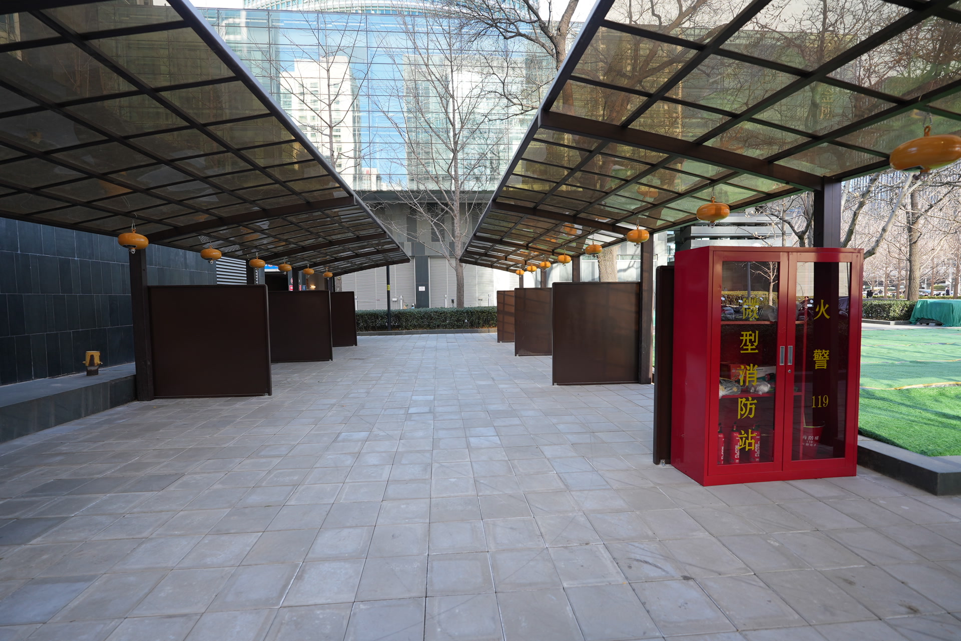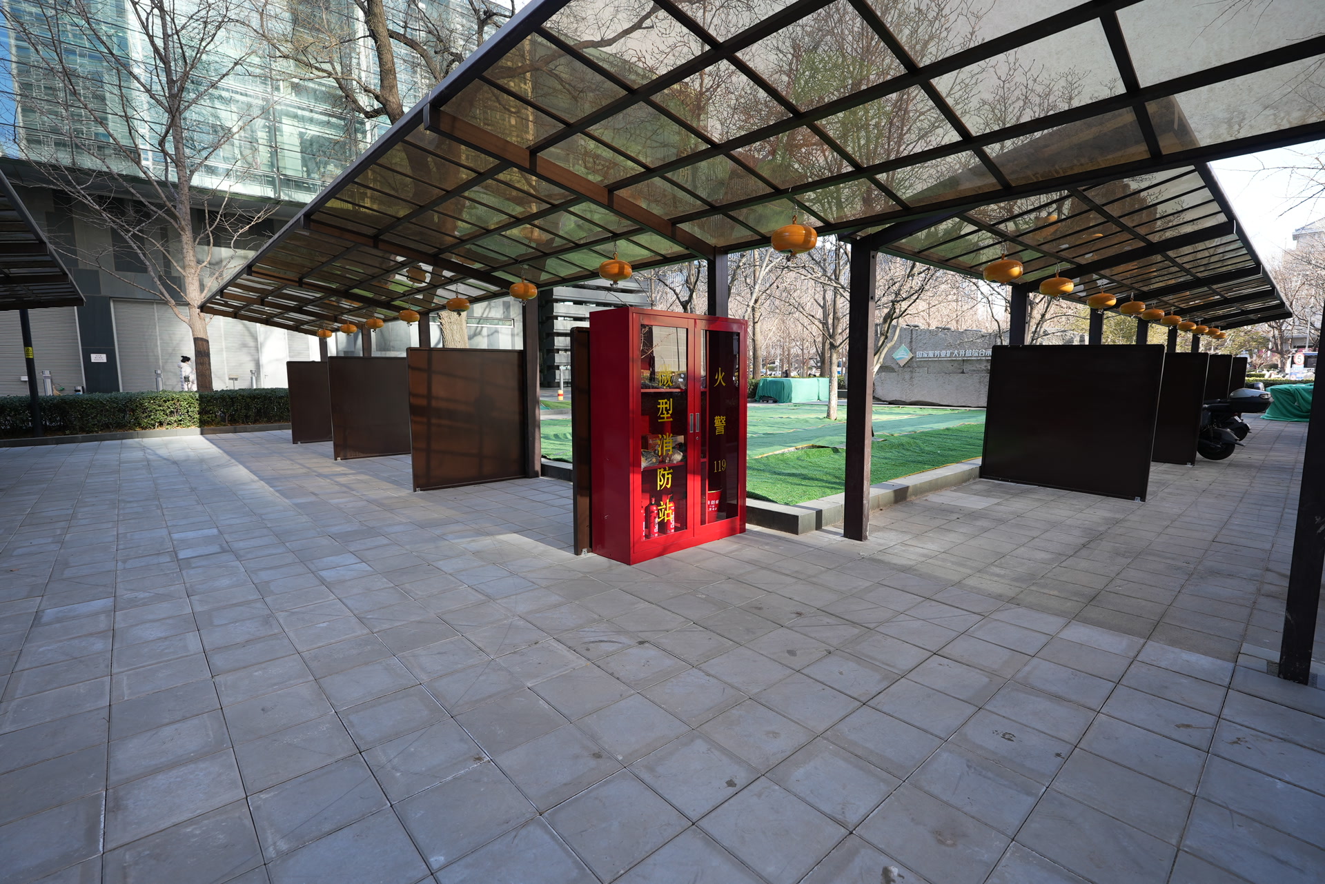 记者在中国人寿中心北侧看到,新建成的电动自行车专属停车棚干净整洁,外观与周围环境协调,不仅安装了视频监控,还加装了阻火隔板,悬挂着自动灭火装置,摆放着两个灭火器材箱。