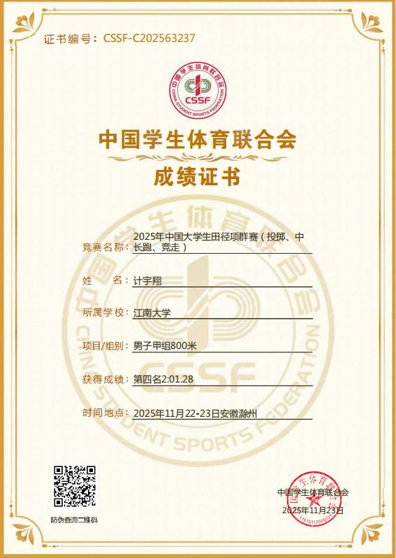 计宇翔,食品科学与工程专业2301班本科生,江南大学中长跑队队员。在校期间获2025年中国大学生田径项群赛男子甲组800米第四名,无锡市第十四届运动会男子高校组800米、1500米冠军,2024年无锡市大中学生田径运动会高校组男子800米冠军、400米亚军,江阴市第九届全民运动会田径比赛男子高校组800米冠军,2023年无锡市大中学生田径运动会高校组男子400米、800米第四名,江南大学第二十三届运动会男子800米、1500米冠军,2023年江南大学新生运动会男子1500米冠军。无锡市高校组1500米、校800米、1500米最高纪录、记录保持者。获评江南大学运动达人、江南大学优秀运动员。