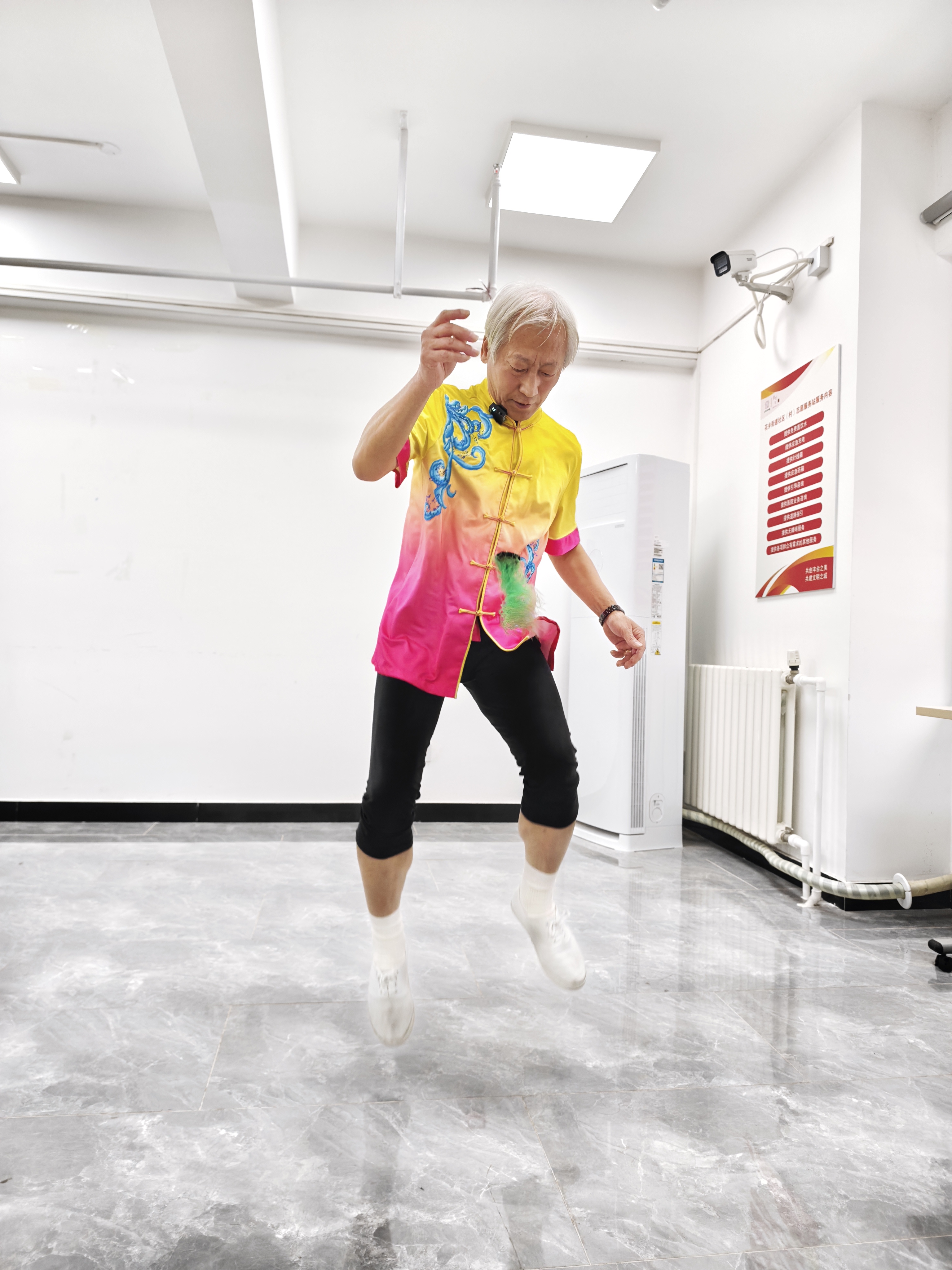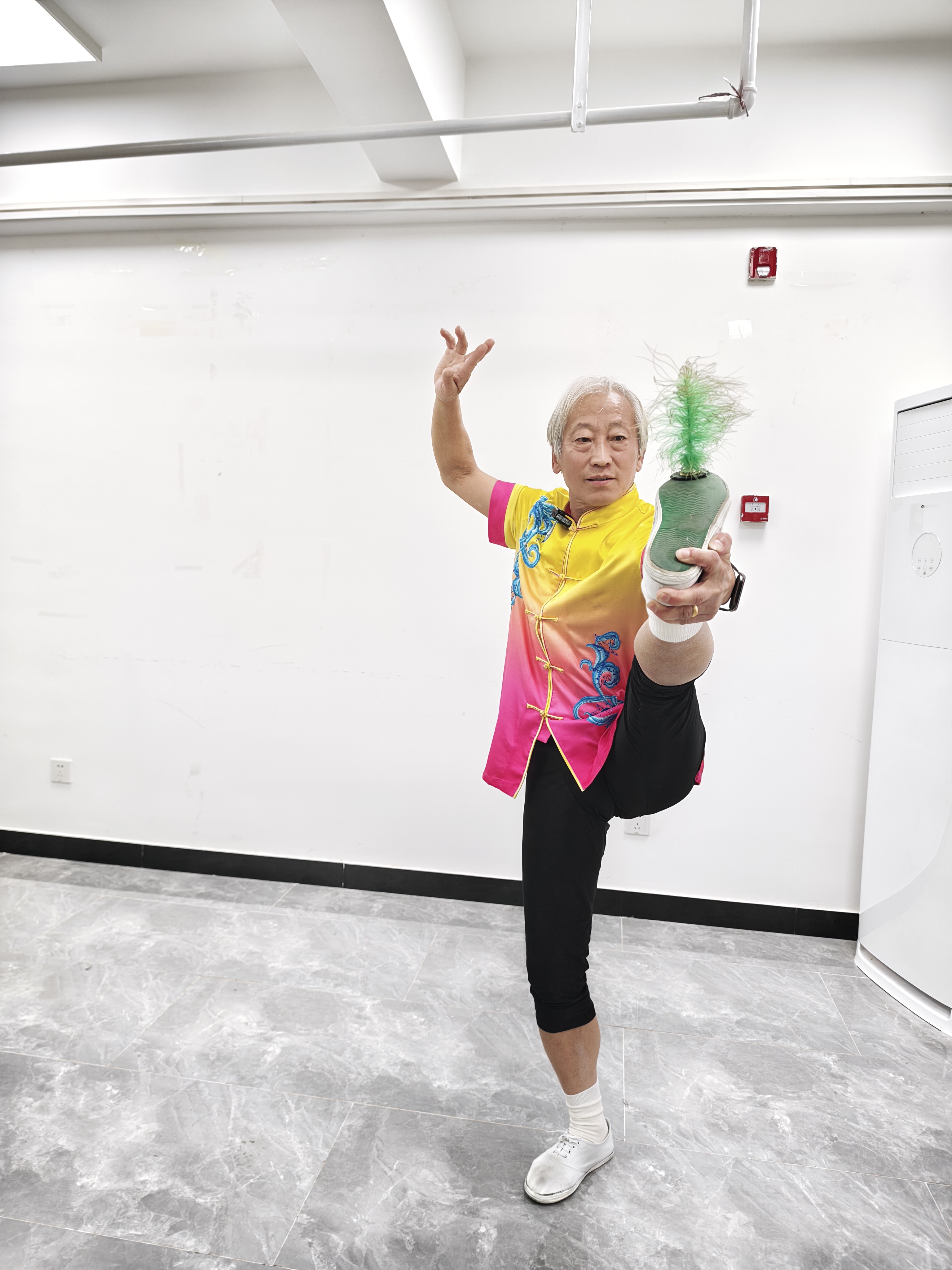 陈国祥最擅长的,还是踢花毽。采访中,他随手展示的几个动作让人眼花缭乱。只见毽子高高抛起,他身体后仰,用脚底在头后位置轻轻一磕,毽子便听话地飞回身前,这招叫“后打”;紧接着,陈国祥向上一踢,毽子从大腿外侧向内侧丝滑地划出一道弧线,他脚背如勺,顺势从大腿内侧“舀”住下落的毽子,这便是“游勺”……
