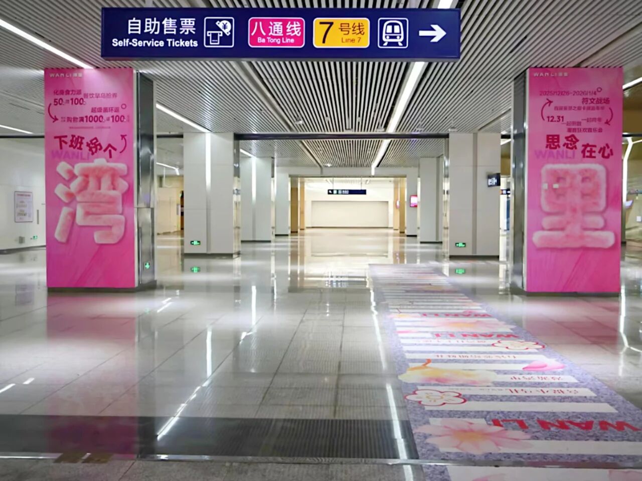 距离湾里最近的地铁花庄站,通过“地毯式”指引轻松化解找路焦虑。市民乘坐7号线或1号线八通线至花庄站后,可从A口、D口直达商场。车站不仅在5块出入口信息牌、24块地面示意图上更新了“湾里”标志,更在出站闸机、扶梯等关键点位增设10块“巨无霸”醒目导向牌。最贴心的是,从站台到商场连接通道,每15米设置一块指引地贴,形成一条不间断的视觉引导线。同时,车站通过广播、扩音器、张贴首末班车时间等多种方式,多频次提醒,确保乘客信息获取无障碍。