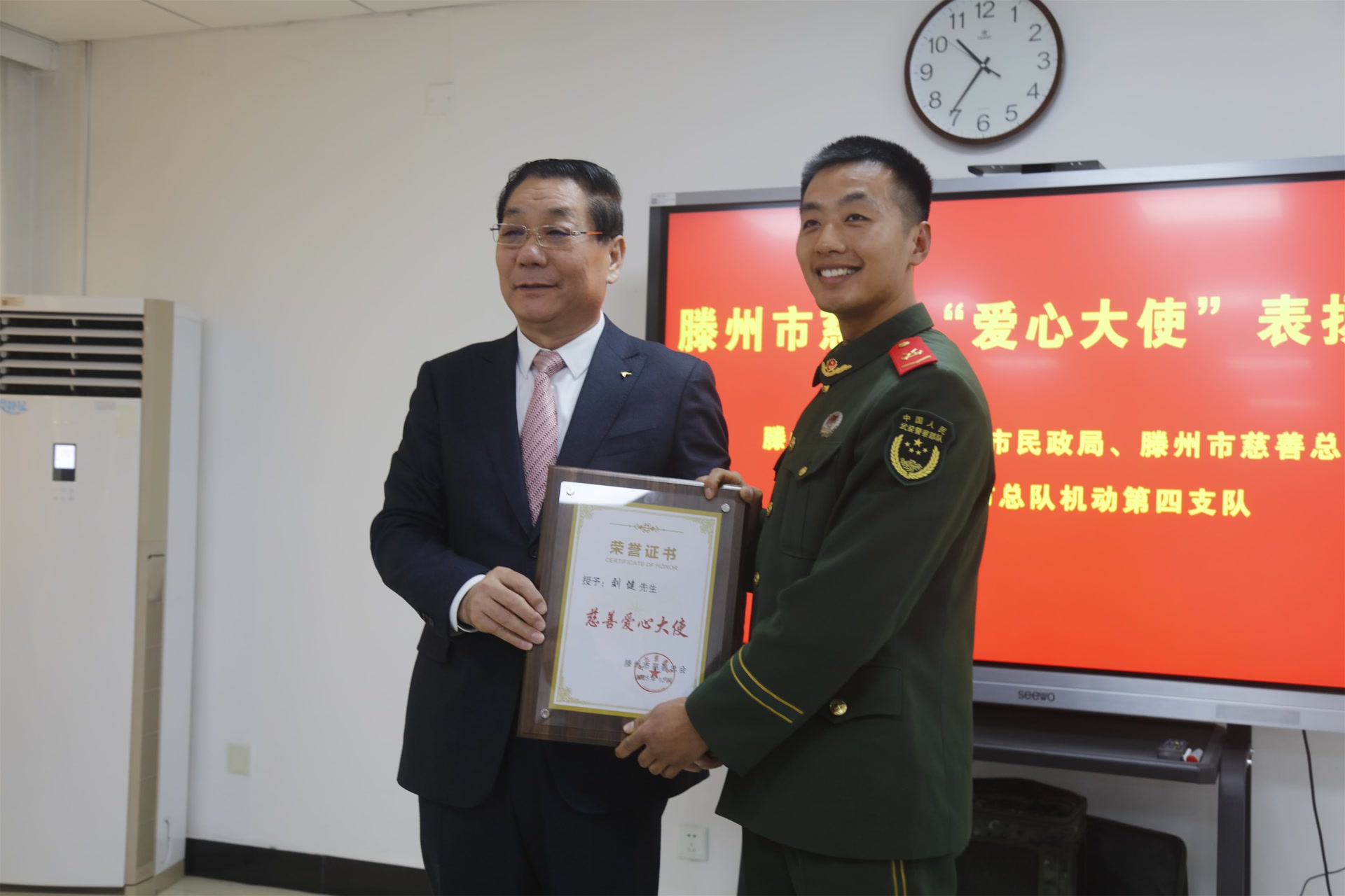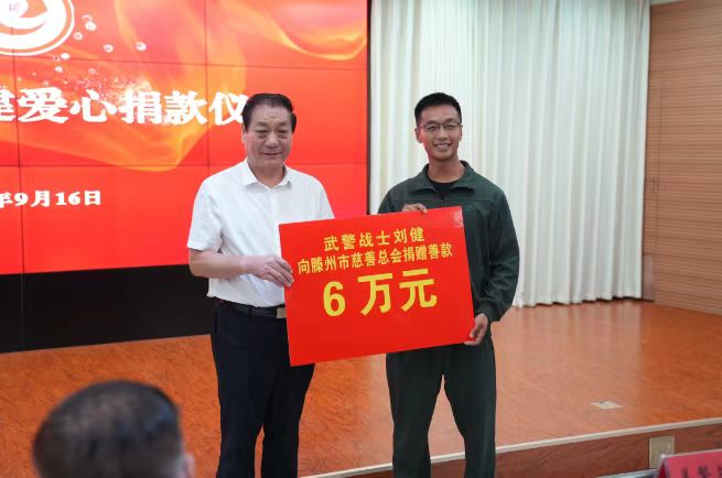 近日,武警北京总队机动某支队营区内掌声阵阵、暖意浓浓。滕州市政府党组成员专程到访,为该支队战士刘健举行滕州市慈善“爱心大使”颁授仪式。支队领导及部分官兵代表共同出席,见证这份凝聚军民鱼水情的荣誉时刻。