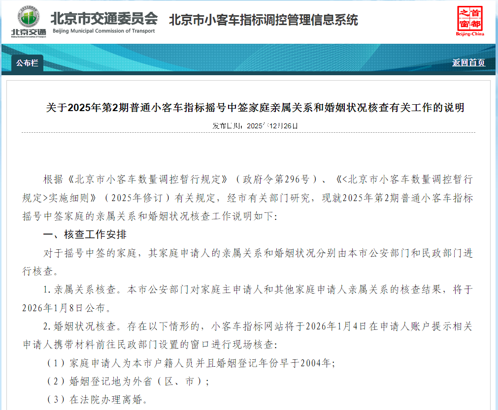根据《北京市小客车数量调控暂行规定》(政府令第296号)、《<北京市小客车数量调控暂行规定>实施细则》(2025年修订)有关规定,经市有关部门研究,现就2025年第2期普通小客车指标摇号中签家庭的亲属关系和婚姻状况核查工作说明如下: