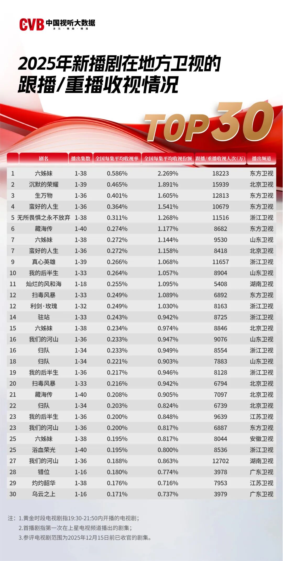 2.反映当代火热生活实践的电视剧广受欢迎,收视屡创新高。春节档播出的《六姊妹》收视反响热烈,在CCTV1首播时全国收视率4.349%,成为CVB自2018年有记录以来唯一全剧平均收视率超过4%、单集超过5%的剧目,全年共在18个卫视频道播出,总收视规模超58.7亿,位列CVB电视剧收视率榜单第一、腾讯视频2025年度热度值榜单第四;在东方卫视重播时收视率0.586%,位列2025年地方卫视重播电视剧收视率榜单第一。展现运河文化的现实题材剧《北上》收获优异收视,在CCTV1首播时全国收视率3.615%,位列CVB有统计以来电视剧收视率第三,首播期间带动CCTV1黄金剧场日均收视率较剧目开播前期上涨19.5%,#电视剧北上# 微博话题总阅读量突破15.5亿。聚焦乡村振兴的《青山是故乡》《乌蒙深处》,在CCTV1首播时全国收视率分别为3.155%、2.724%,首播收视规模分别达到7.8亿、7.0亿人次,位列2025年度电视剧收视率榜单第五、第十二,其中《乌蒙深处》进入2025年芒果TV电视剧播放量前十。《淬火年代》聚焦民营制造从业者的奋斗故事,在CCTV1首播时全国收视率3.030%,收视份额13.273%,位列2025年度电视剧收视率榜单第六,首播收视8.5亿人次。《护宝寻踪》在CCTV1首播时全国收视率3.023%,收视份额13.037%,首播收视8.8亿人次,位列2025年度电视剧收视率榜单第八。《红石榴餐厅》讲好新时代新疆故事,在CCTV1首播时全国收视率2.764%、收视份额12.062%,首播收视5.4亿人次,位列2025年度电视剧收视率榜单第十一,该剧在新疆地区尤其受到观众欢迎,新疆本地收视率7.453%、收视份额29.653%,在全国31个省区市中领先。《灿烂的风和海》聚焦澳门青年奋斗故事,在CCTV1首播时全国收视率2.648%,收视份额11.507%,首播收视4.4亿人次,位列2025年度电视剧收视率榜单第十三。家庭情感剧《四喜》在CCTV1首播时全国收视率2.356%,收视份额9.419%,首播收视8.2亿人次,位列2025年度电视剧收视率榜单第十七、腾讯视频电视剧热度值榜单第七。《大河之水》在CCTV8首播时全国收视率1.761%,收视份额6.885%,首播收视6.7亿人次,位列2025年度电视剧收视率榜单第二十四。