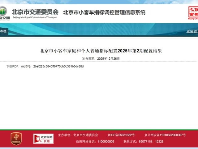 北京市小客车家庭和个人普通指标配置2025年第2期配置结果,已在“北京市小客车指标调控管理信息系统” 网站公布。详情>>
