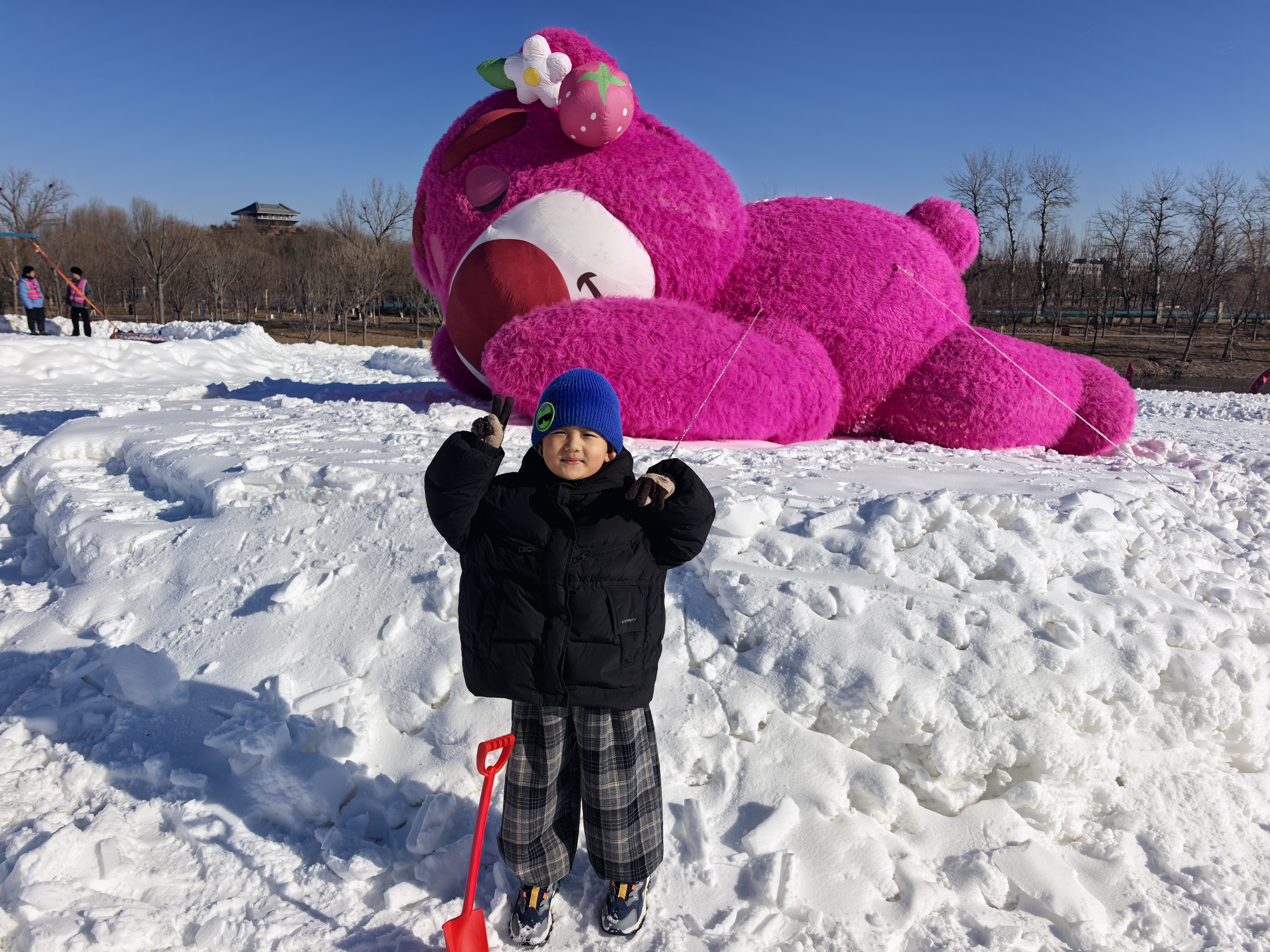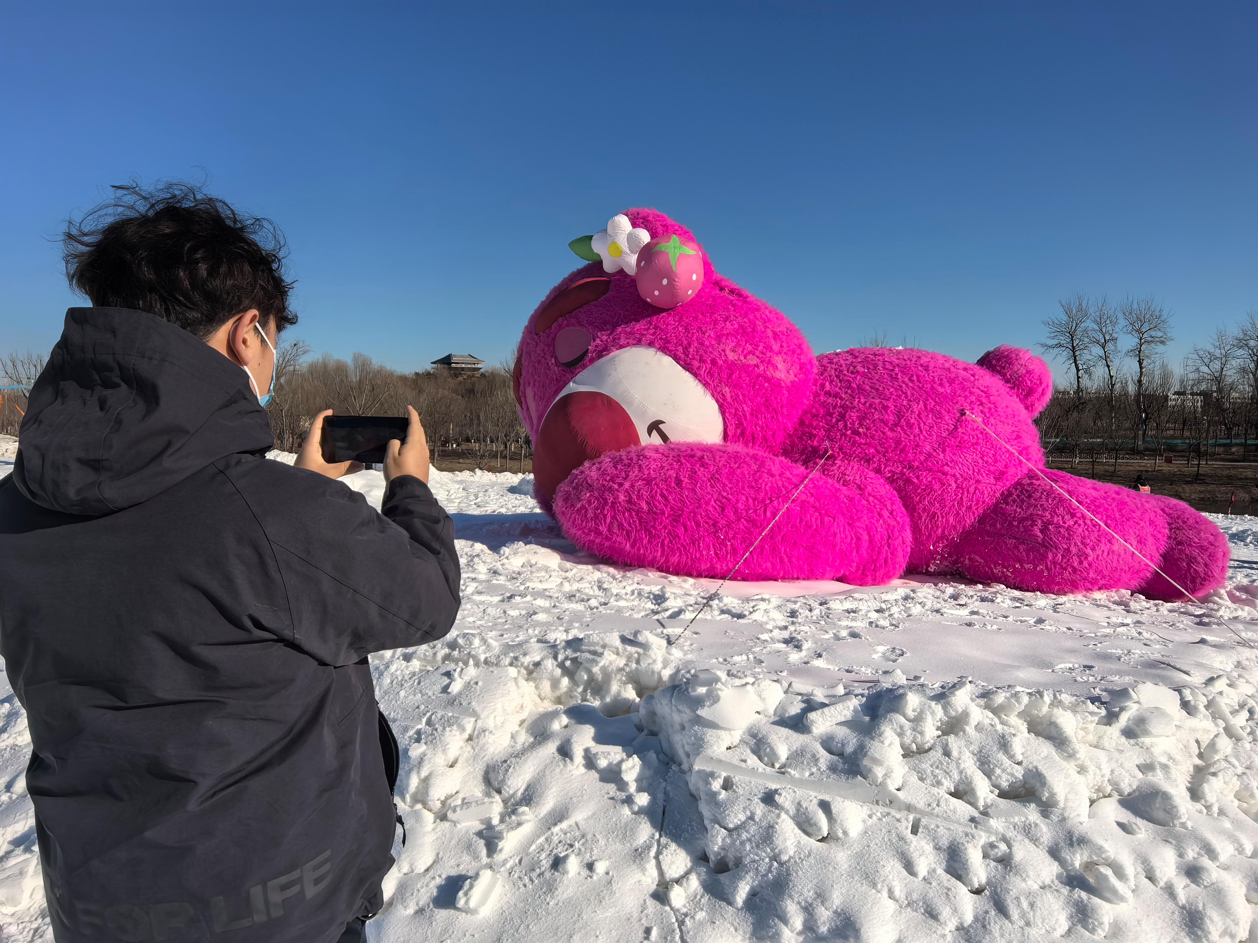 “刚进门就被这个大草莓熊吸引了,在白雪里显得更漂亮、更可爱了,孩子说什么都要和它来个合影!”带着女儿前来游玩的李女士举着相机,记录下女儿与草莓熊玩偶的温馨同框。