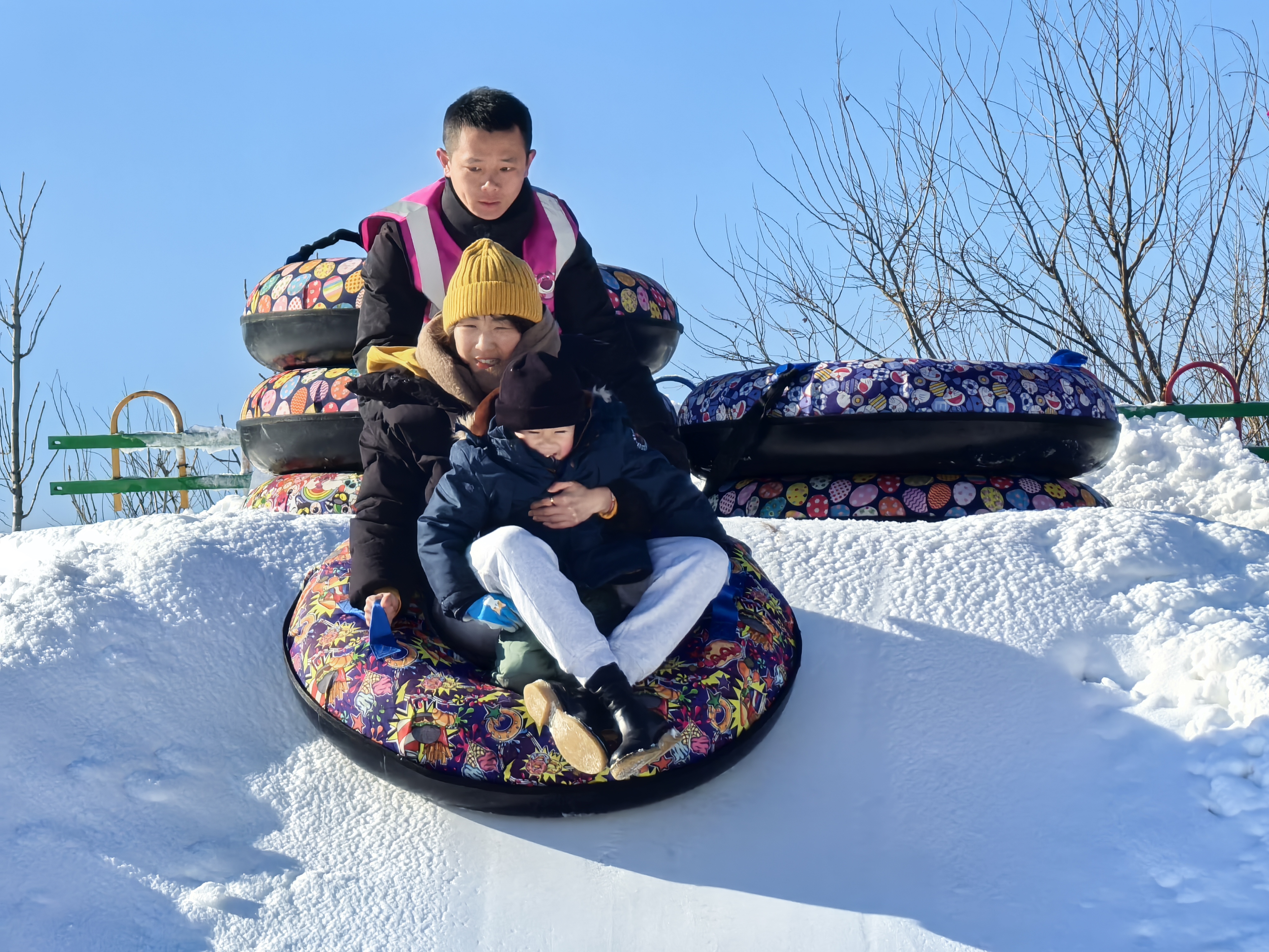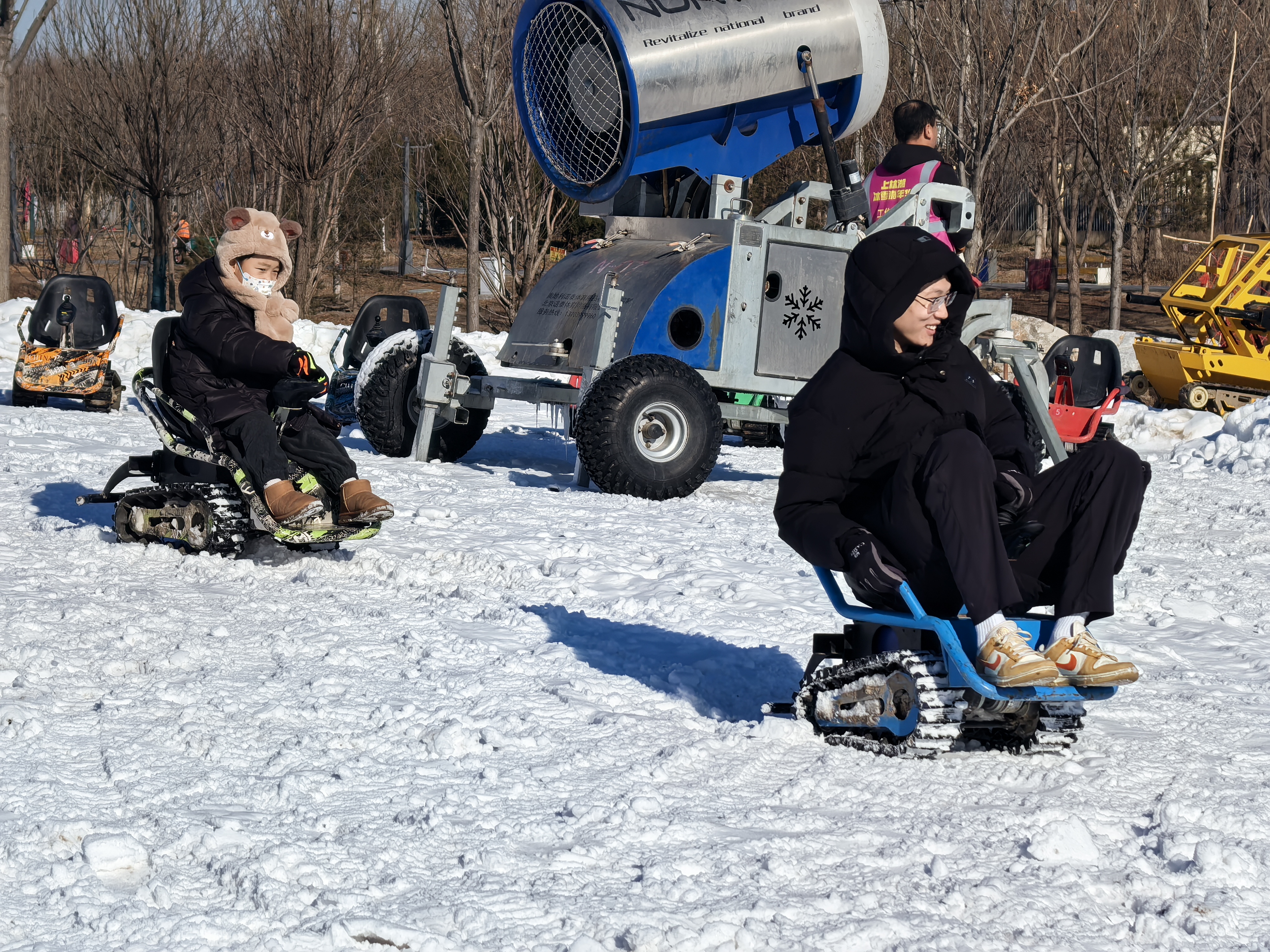 在上林湖冰雪嘉年华核心体验区内,多种解锁冬日快乐的娱乐项目也正在同步进行。雪地摩托区内,游客们佩戴头盔、握紧车把,在赛道上风驰电掣,轮胎碾过积雪溅起阵阵雪雾,上演冬日版的“速度与激情”;雪地坦克区内,不少游客驾驶着迷你坦克开启“冰雪征服之旅”,坦克履带压出深深的雪痕,引擎轰鸣与雪花飞溅碰撞出别样的冬日火花;“雪地寻宝”成为亲子家庭必冲项目,宝藏卡片被藏于皑皑白雪之中,在亲子协作间不断发掘惊喜;火烈鸟小火车满载粉色浪漫,缓缓穿行在雪地间,车厢里的孩子们探头探脑,仿佛驶向如梦似幻的童话秘境……“这里的项目丰富多样,不仅孩子喜欢玩,我这个大孩子也玩得不亦乐乎,冬日冰雪娱乐氛围很浓厚,绝对是亲子游的不二之选!”和孩子在雪地“冲浪”的杜先生笑着说道。