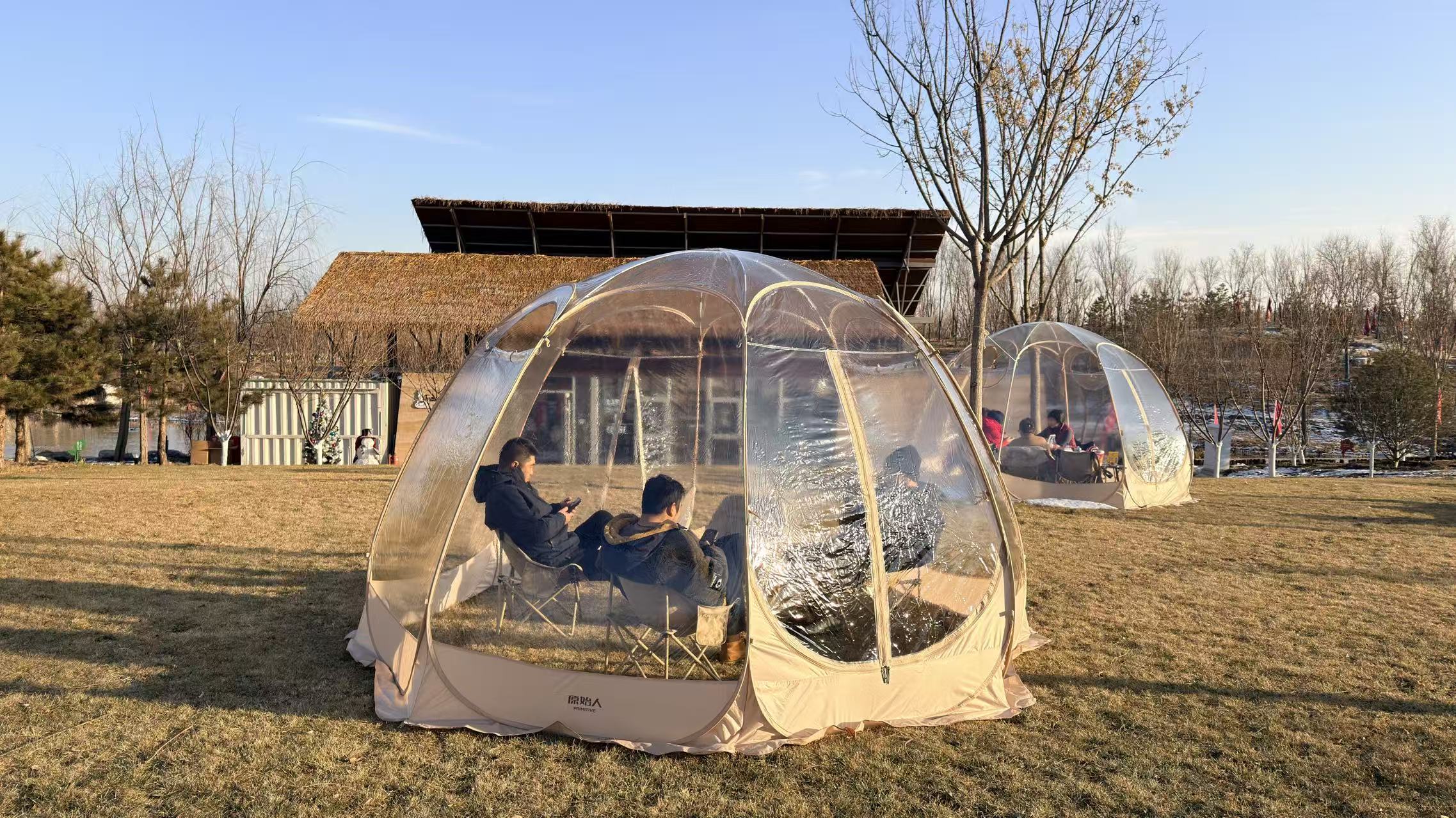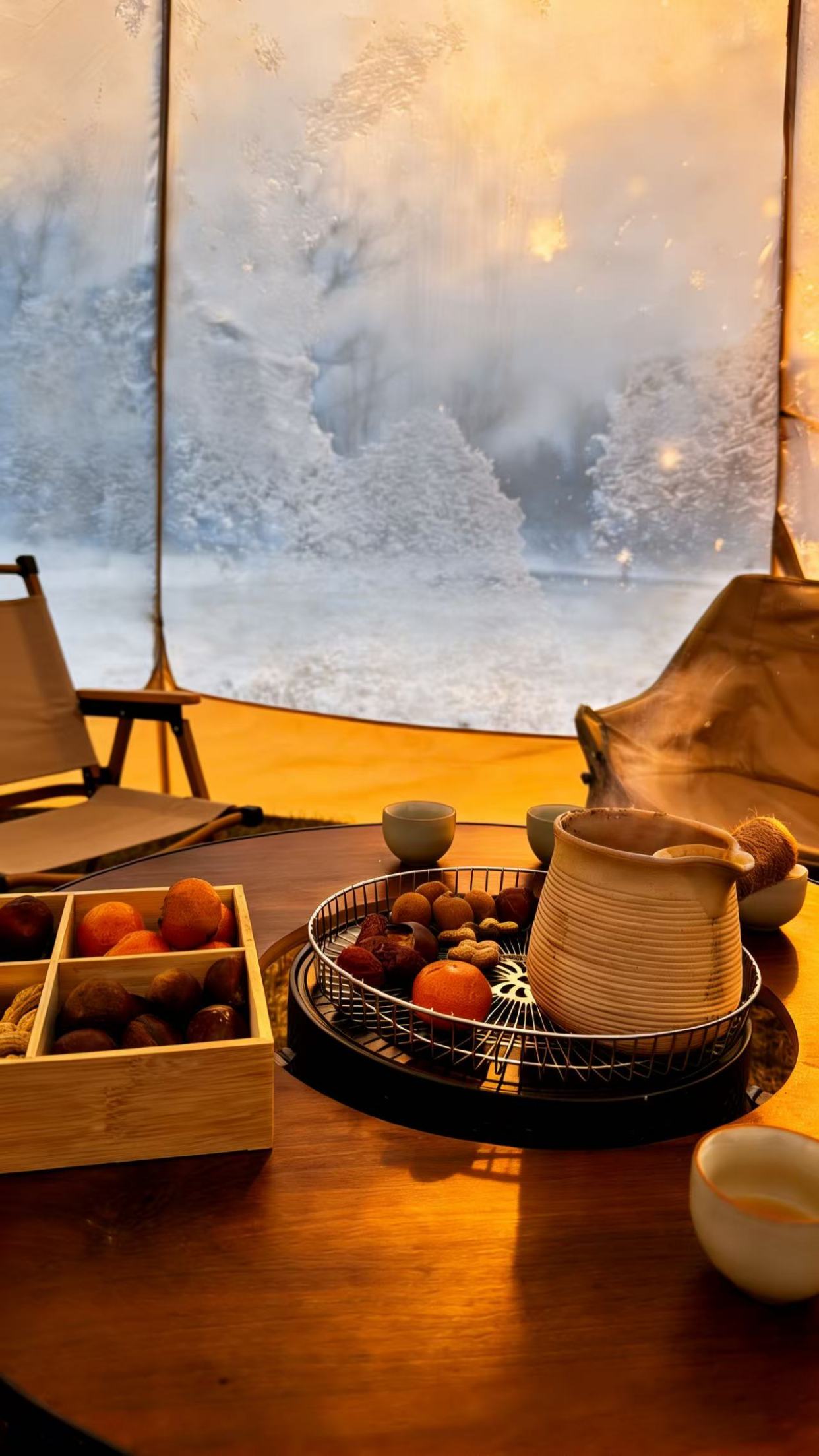户外是冰雪嘉年华的热闹欢腾,农场记忆咖啡厅则是游客“回血充电”的绝佳去处。全新上线的3顶星空帐篷错落分布,阳光透过篷顶洒在木质桌椅上。帐篷内,三五好友围坐闲谈,陶炉上的砂壶咕嘟作响,陈皮、桂圆、红枣与茶叶慢慢交融,茶汤渐染成琥珀色,热气顺着壶嘴袅袅升起。铁网上,红薯、橘子、花生整齐码放,焦香混着茶香漫溢开来。“在雪地里玩得浑身发冷,进来喝杯热茶、吃块烤红薯,别提有多舒服、多幸福了!”和朋友们正在围炉煮茶的大学生安琪向记者说道。