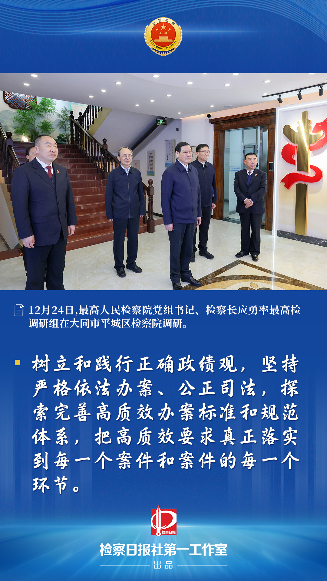 12月24日至26日,最高人民检察院党组书记、检察长应勇率最高检调研组,围绕强化检察监督,全面提升法律监督质效,更好服务经济社会高质量发展,到山西大同、忻州等地调研。