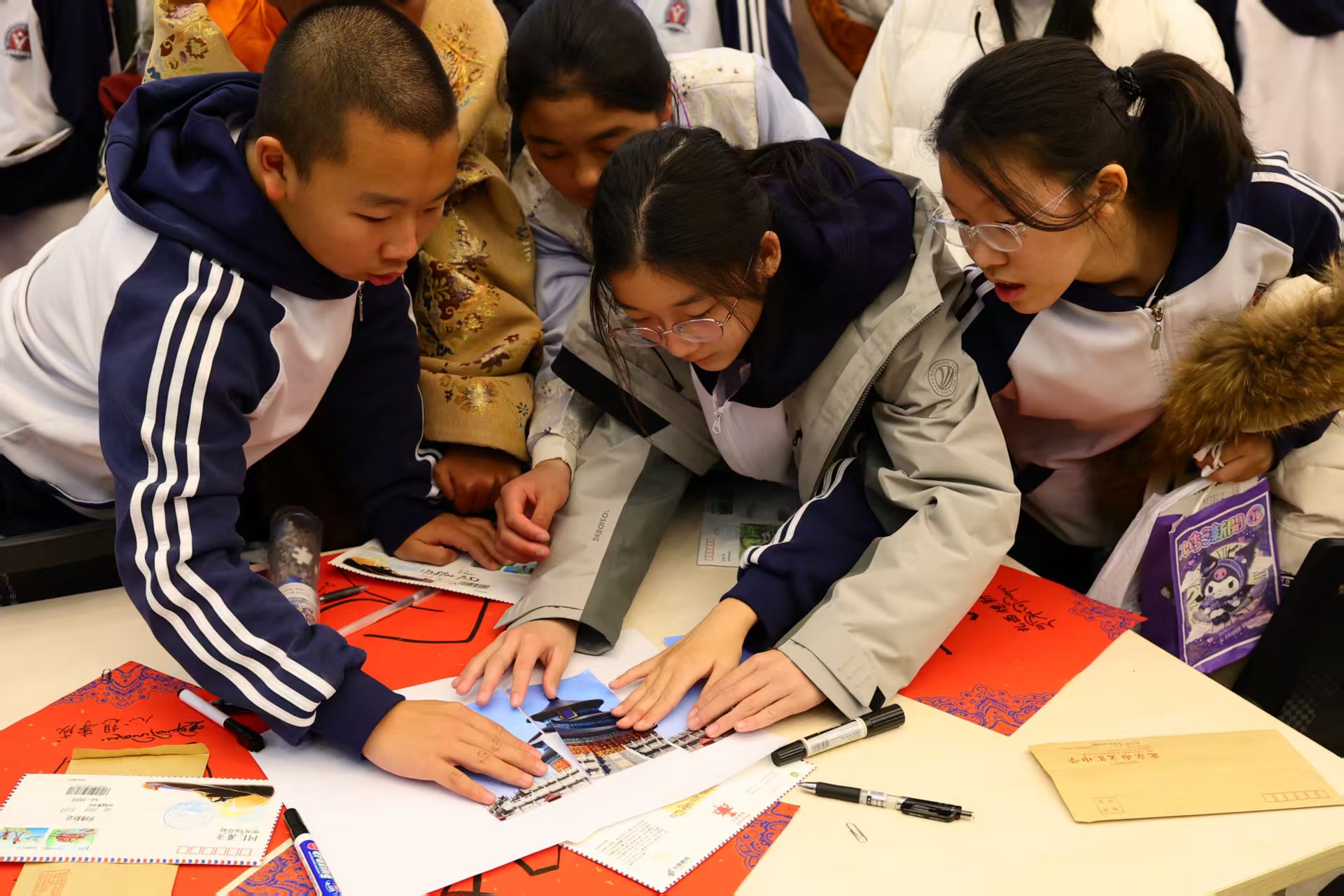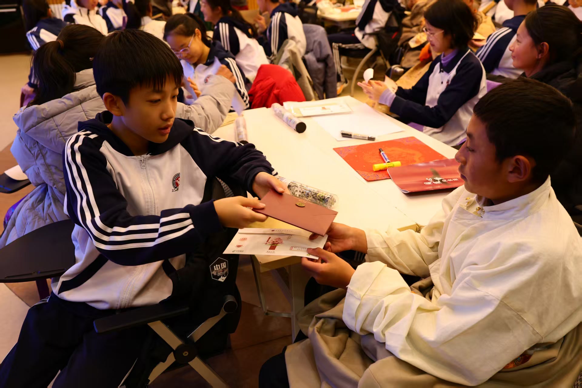 活动现场,30组京藏学生一对一结对,交换了精心准备的信封与礼物。信封里,装着两地青少年用笔墨书写的问候、家乡见闻和对友谊的憧憬。与西藏伙伴互读信件后,文汇中学初二学生娄禹辰说:“书信拉近了我们心灵的距离,让我亲身感受到了文化的交融,希望我们的友谊地久天长!”接下来的一周时间里,京藏两地学生将朝夕相伴:共上课程、共同开展科学实验、一起进行沙画创作等;他们还将采用混合分组模式参与“班超联赛”,在团队竞技中协作攻坚。