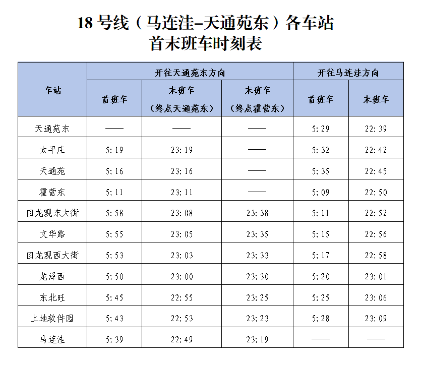 地铁18号线(马连洼—天通苑东),途经海淀、昌平两区,约19.8公里,单程只需约30分钟。11座车站中4座为换乘站,可分别在马连洼站换乘16号线、回龙观东大街站换乘8号线、天通苑站换乘5号线、天通苑东站换乘17号线。根据客流预测分析,预计开通后工作日日均客流量将达22.83万人次,工作日最小发车间隔4分45秒。18号线开通后,可有效缓解“回天地区”至中关村软件园区域交通压力。18号线天通苑东站首班车时间为5:29,末班车时间为22:39;马连洼站首班车时间为5:39,末班车时间为全程22:49,半程23:19。