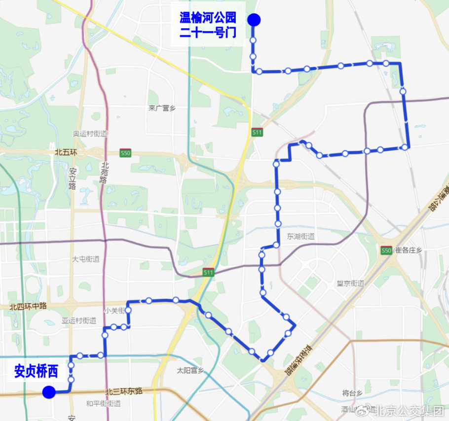 调整后首末站:温榆河公园二十一号门-安贞桥西