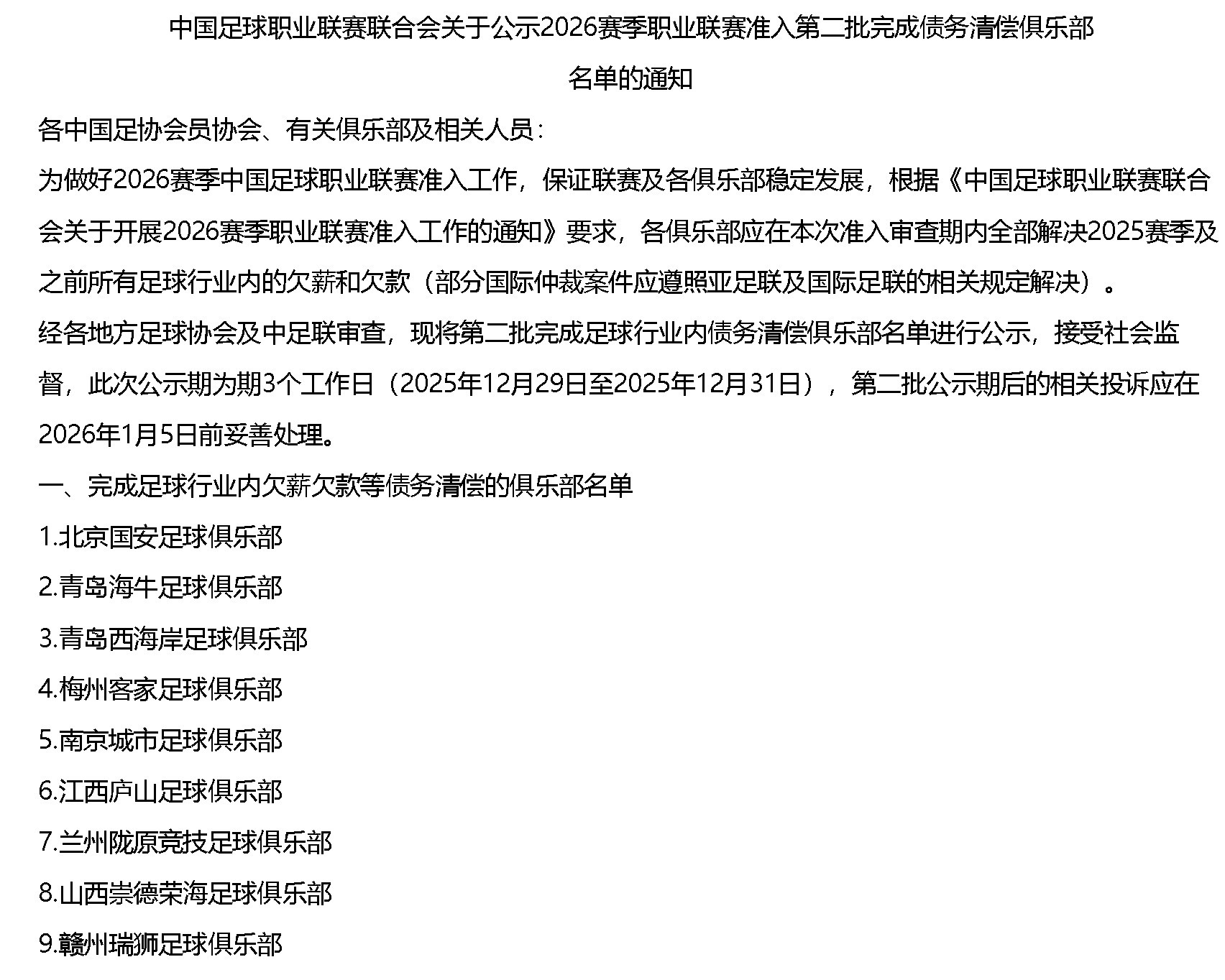 12月26日晚,中足联官网发布公告,公布了2026赛季职业联赛准入第二批完成债务清偿俱乐部名单。并未出现在第一批名单上的北京国安俱乐部这次上榜,扫清了下赛季联赛准入的障碍。