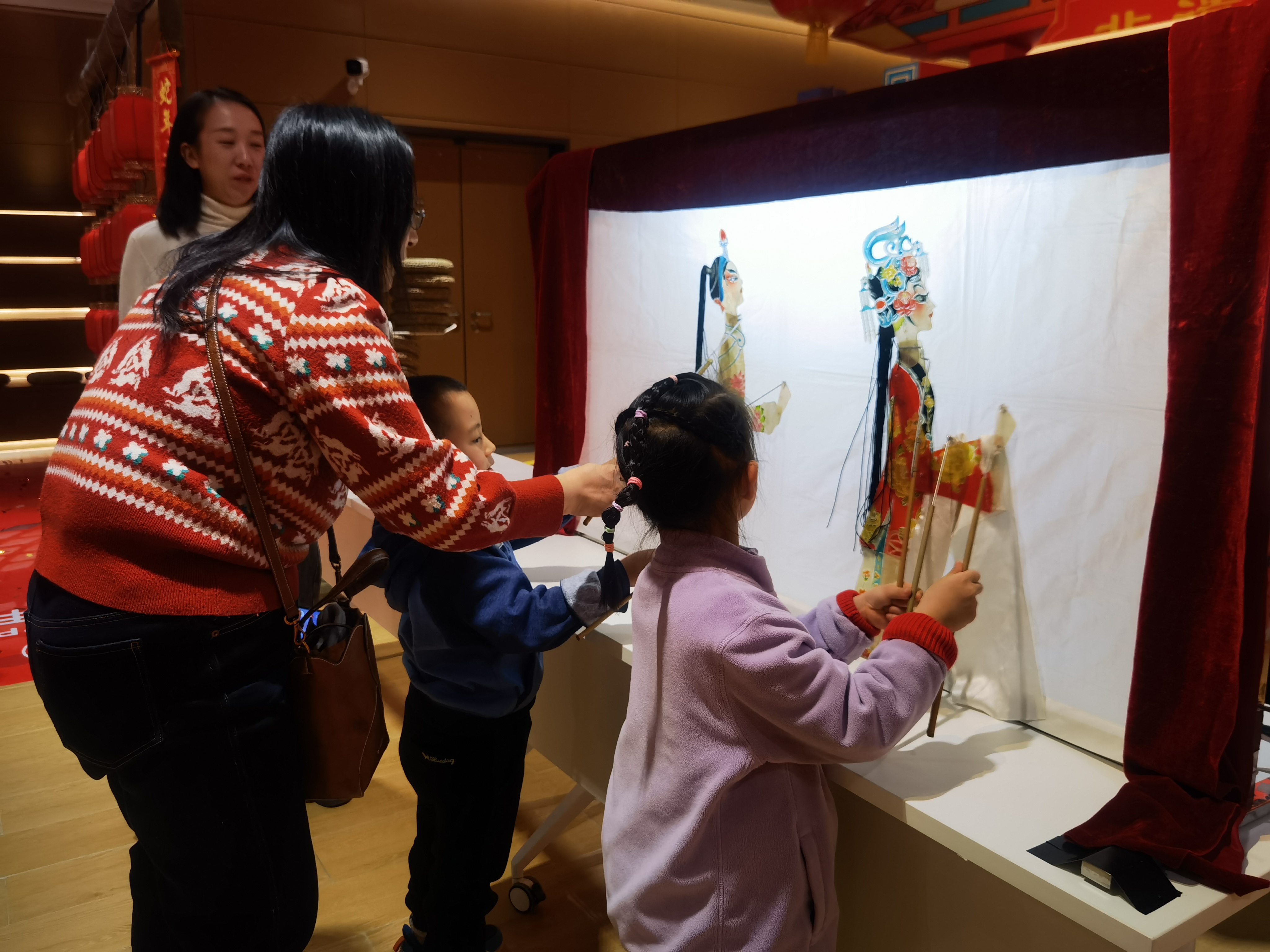 2025年新春,北京城市图书馆非遗集市上读者在体验皮影。