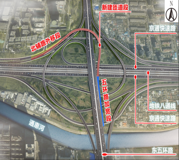新匝道通车后,东五环与京通快速路将实现全方向互通,经远通桥进京车辆可减少绕行距离约5.6公里,节约通行时间约15分钟,将显著提升广渠快速路、京哈高速等东部路网的通达性,进一步强化城市副中心与中心城区的交通联络效率,为区域经济社会发展提供有力支持。