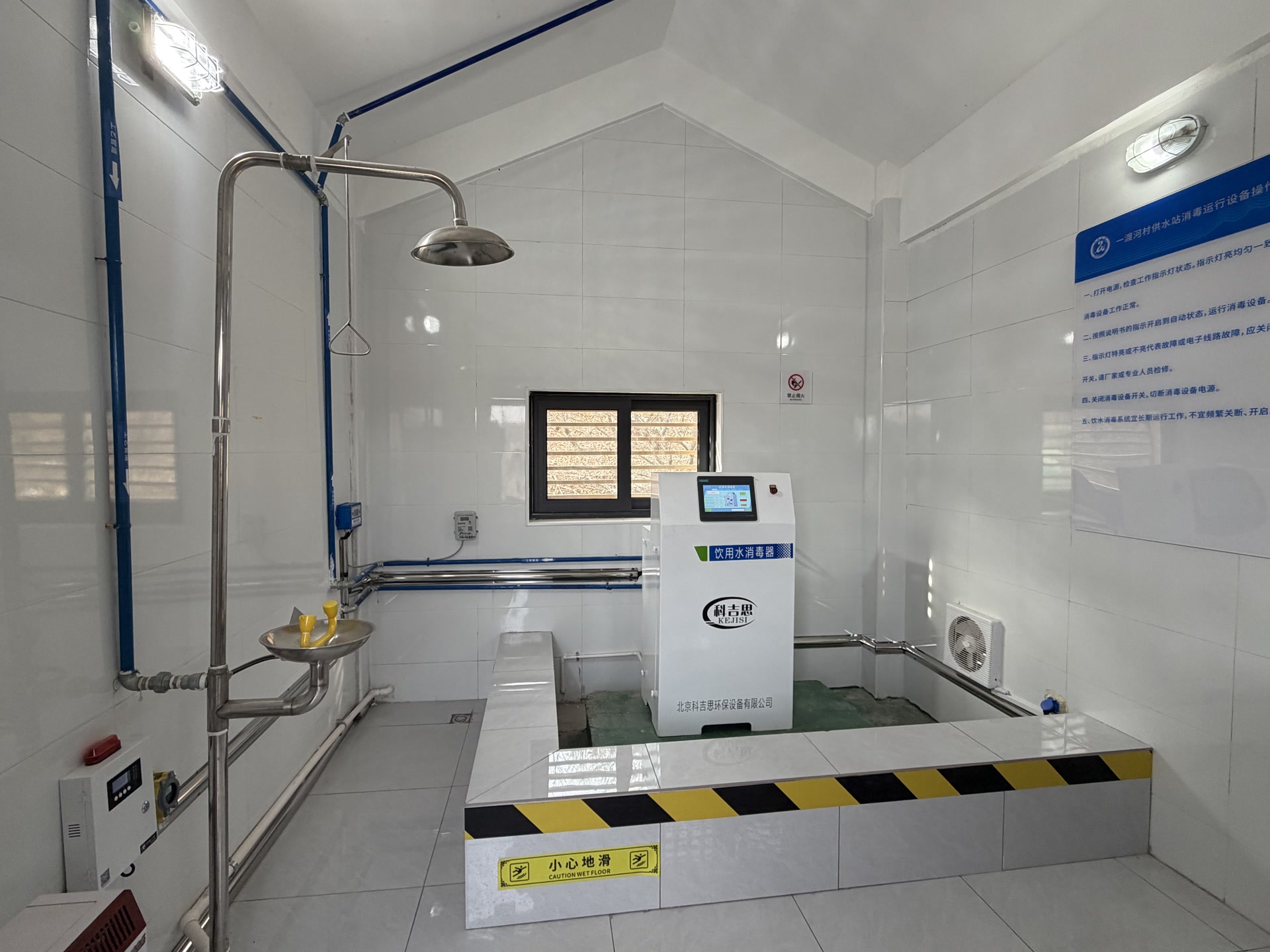一旁的泵房,水泵将地下水从水井抽出,地下水与消毒药剂共同流进混合器中,再被抽至更高处的蓄水池中。在这里,消毒药剂与水充分反应,水通过重力顺着管线流进千家万户,再流进村民的水龙头。