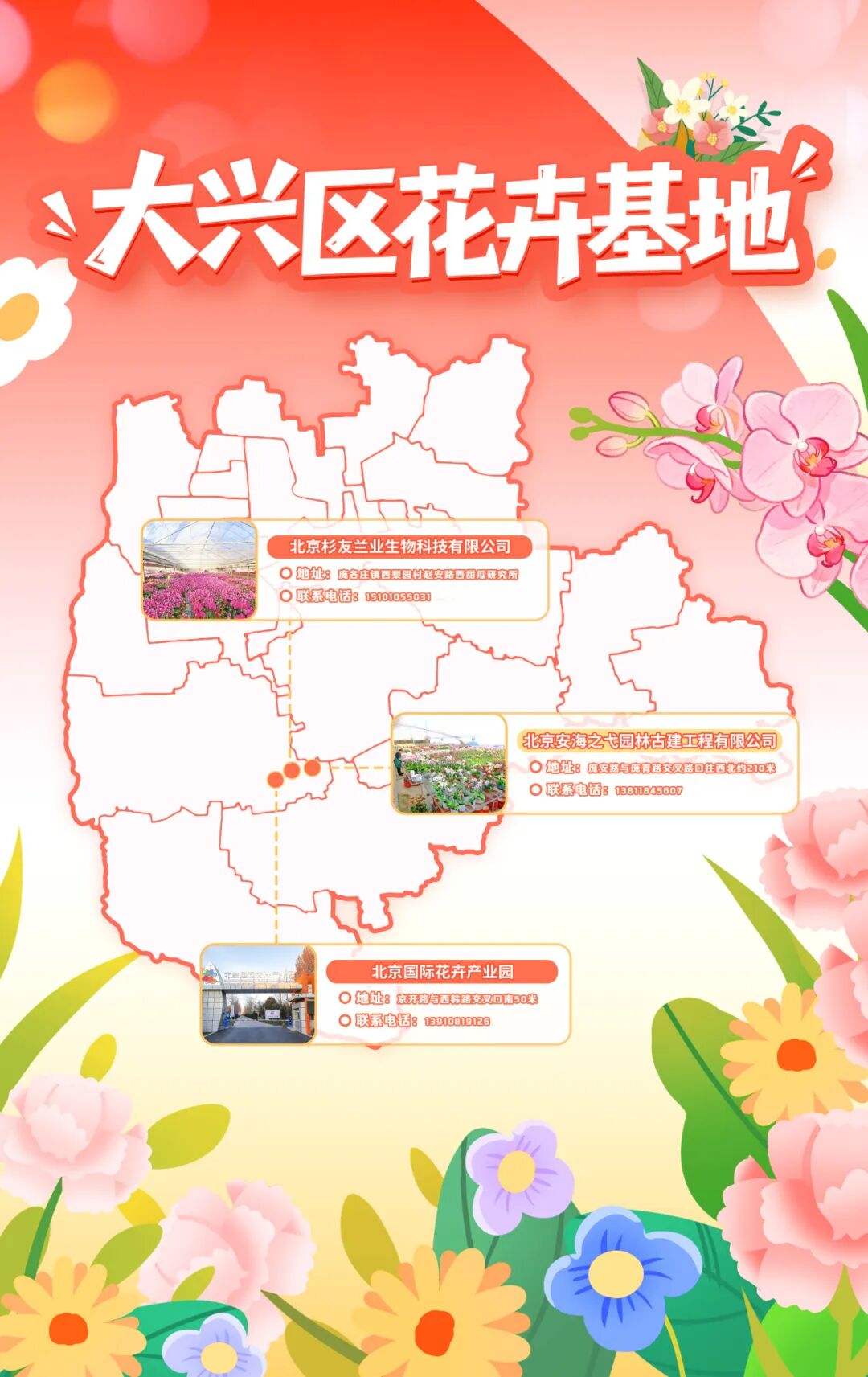 • 北京杉友兰业生物科技有限公司:庞各庄镇的蝴蝶兰专业种植基地,各色蝴蝶兰清雅脱俗,是年宵花的高端之选。