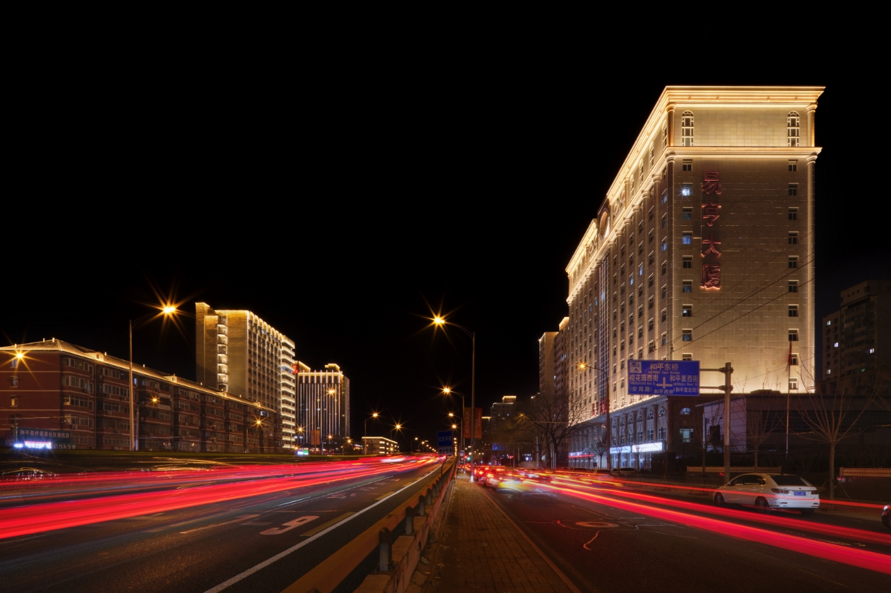 三环路北段(三元桥至安华桥)全长5.6公里,定位为国际商务通廊夜景轴带。沿线120余栋建筑在灯光改造后焕然一新,暖金色光带串联起商圈、社区与交通节点,将市井烟火与商务楼宇的现代感有机融合。灯光设计根据不同建筑功能分类实施:公共建筑突出庄重大气,住宅照明则以柔和温馨的暖光为主,在补足原有照明暗区的同时,塑造出层次分明、动静结合的夜间天际线。