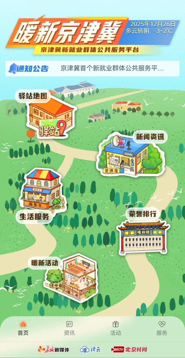 为了做好新就业群体的思想引导和凝聚服务工作,坚持网上网下结合,12月26日,长城新媒体集团、北京时间有限公司、津云新媒体集团联合策划推出的“暖新京津冀——京津冀新就业群体公共服务平台”正式上线,这也是京津冀首个跨区域、全链条的新就业群体智慧服务集成平台。
