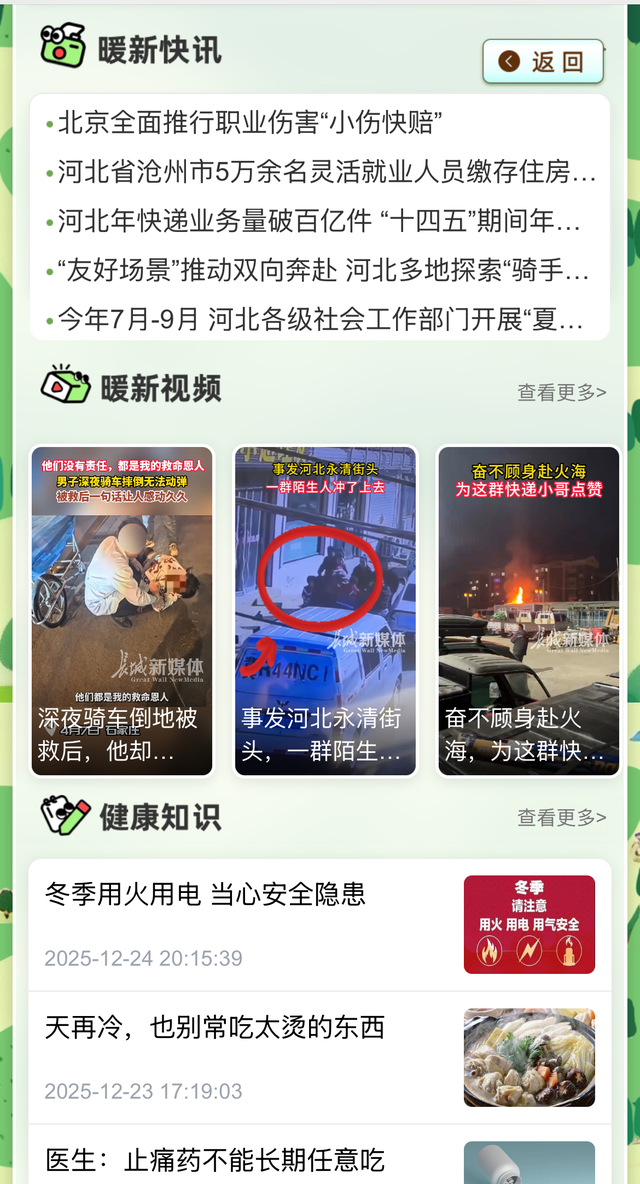 在“新闻资讯”板块中,集纳暖新快讯、暖新视频、健康知识等多层次资讯服务,劳动者无需切换软件即可获取行业相关信息。京津冀三地媒体充分发挥主流媒体优势,破解信息获取慢、虚假信息难辨别等问题,体现媒体责任与担当,让小程序兼具新闻性、服务性与创新性,搭建政策资讯与一线劳动者的沟通桥梁。