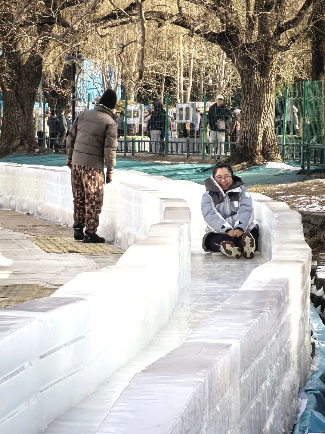 “孙子玩了四遍不肯走!我本来怕冷,结果自己滑下来笑得最大声。”带着孙子来玩的李阿姨笑着说。