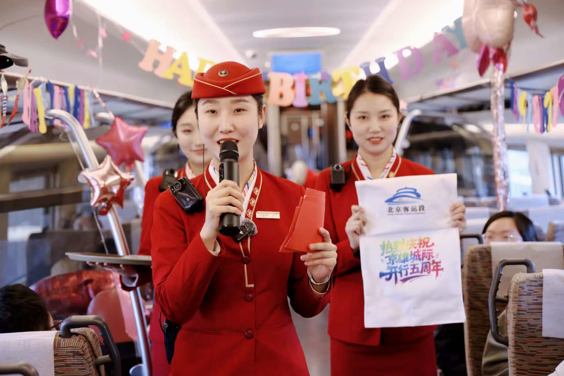 知识抢答、民俗美食问答、心愿打卡……今天上午,由北京西开往雄安站的C2705次列车上,国铁北京局北京客运段举办了“五年飞驰·智联京雄——轨道上的京津冀成长礼”主题活动。