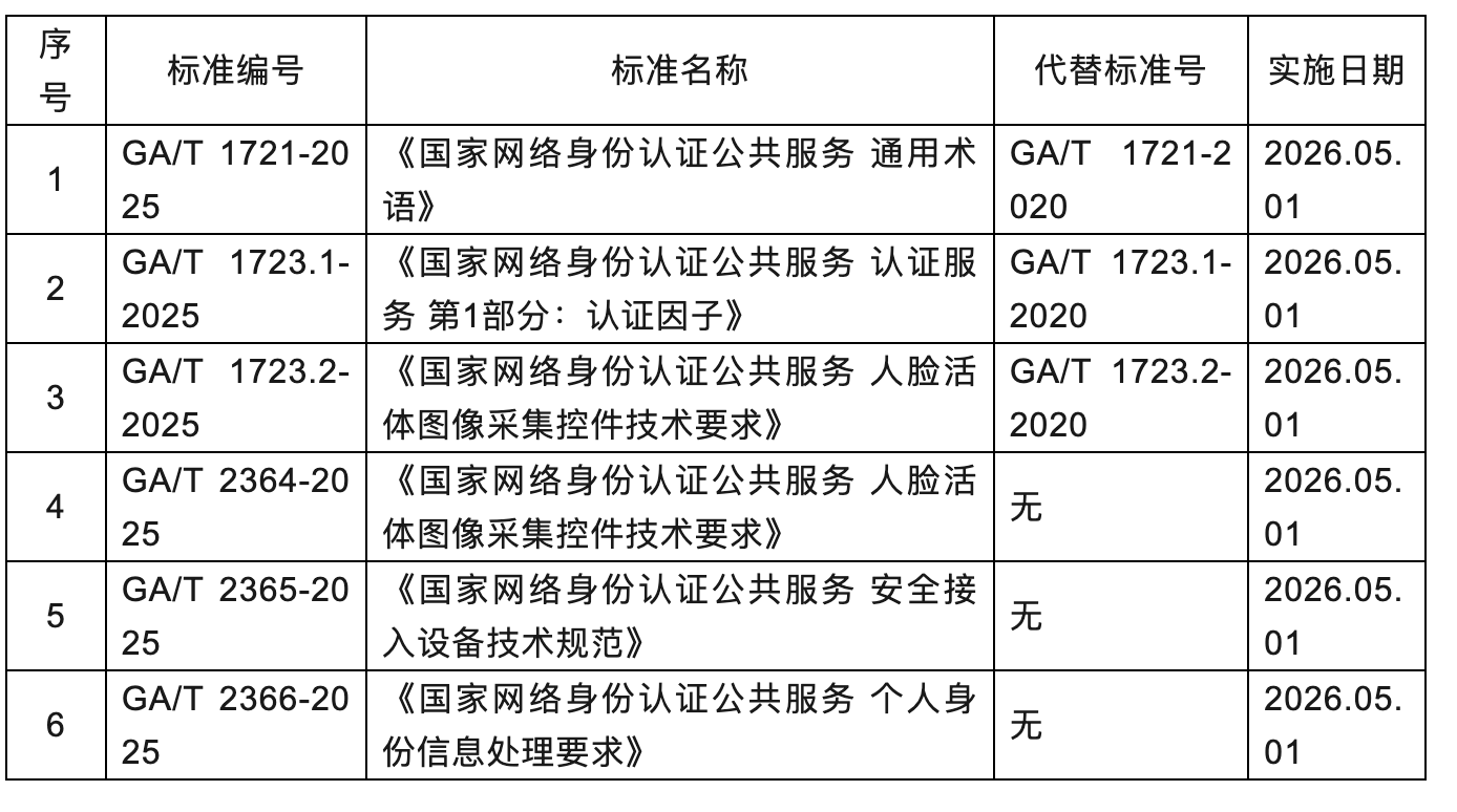 《国家网络身份认证公共服务管理办法》已于2025年5月23日发布,并于7月15日实施。为支撑法规的落地与实施,近日公安部发布了2025年第2号《中华人民共和国公安部公共安全行业标准公告》,国家网络身份认证公共服务标准体系中6项公共安全行业标准正式发布,于2026年5月1日实施。标准具体内容如下: