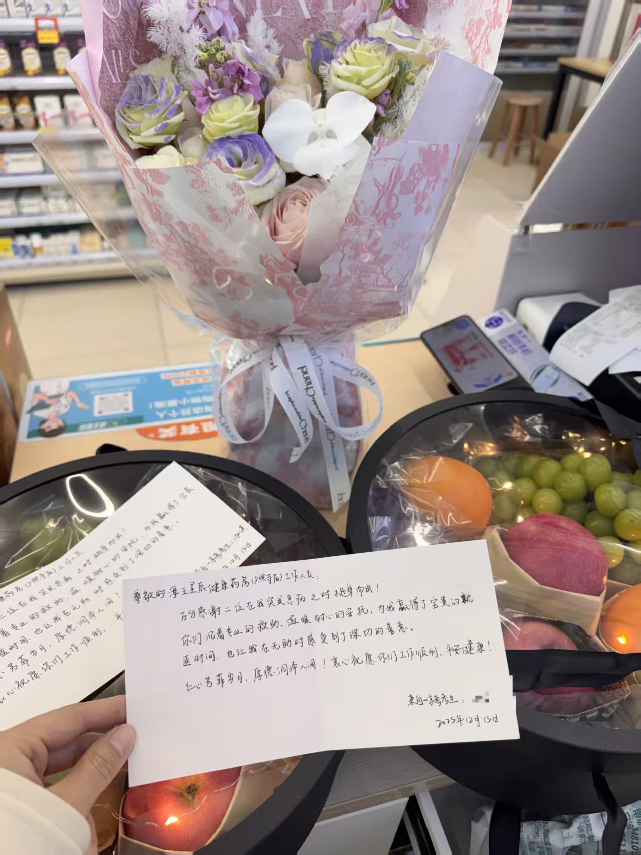 “感谢二位在我突发急病时挺身而出,不仅为我赢得了宝贵的就医时间,也让我在无助时感受到了深切的善意。”近日,北京海王星辰健康药房夕照寺店的执业药师侯雪丽和健康顾问李小欣收到了一份特殊的礼物——一位顾客送来了感谢信、鲜花和果篮,以感谢她们在自己突发急病时,快速施救、全程守护,助其及时得到救治,最终化险为夷。