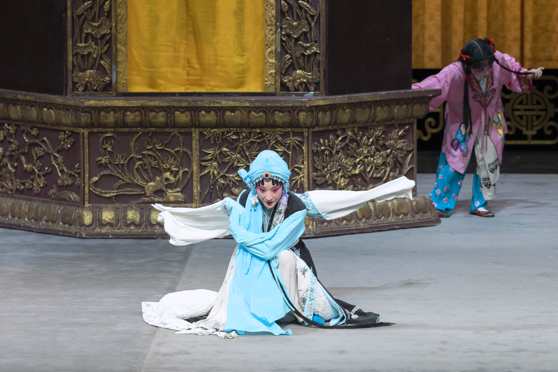 程派的身段极具魅力,刚柔兼具。郭玮的水袖功夫扎实,投袖甩袖都注重运用腕力和小臂的力量,让水袖舞动的轨迹基本呈现一个弧线,符合传统戏曲审美中“圆”的要求。这种身段以她清瘦的身材来演绎更加富有“四两拨千斤”的力量感和美感。