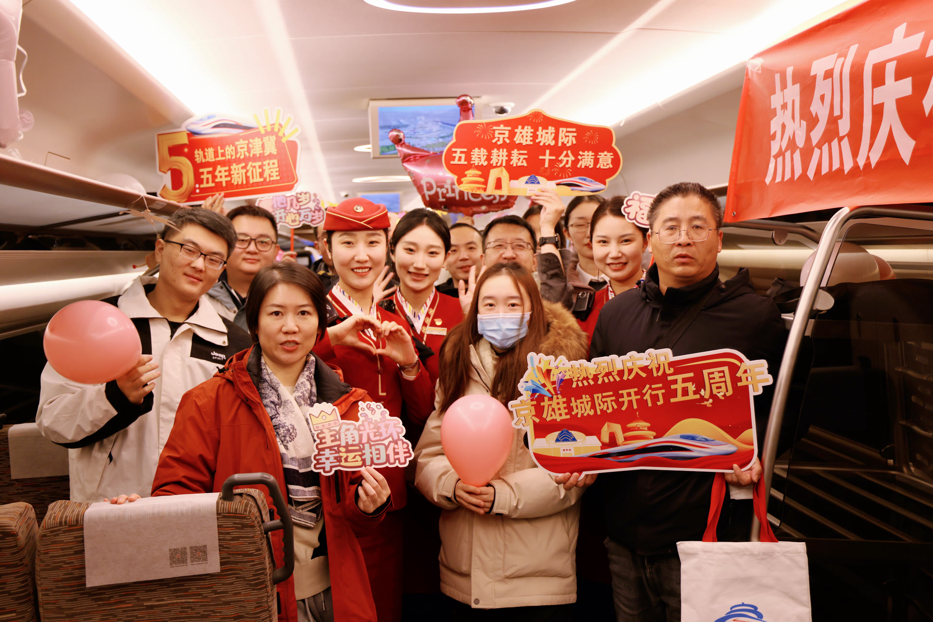 知识抢答环节涵盖京津冀一体化、京雄城际线路信息、复兴号智能动车组等10道题目,不少旅客获得了五周年定制书签等礼品;民俗美食问答环节,“京味三绝”“雄县剪纸”“白洋淀炖杂鱼”等题目让旅客感受到京雄两地的民俗风情。7号车厢中部的主题打卡区,也吸引了不少旅客手持创意牌拍照留念。