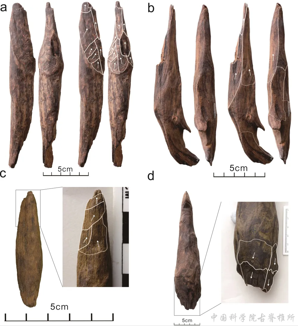 这些木器主要用松木制作,宏观和显微观察发现:一些标本存在因砍枝削尖而留下的削刮痕,尖端发生因使用而产生的磨光条痕和断裂破损。这些痕迹出现在特定部位并具有方向性,是人类加工与使用的证据。