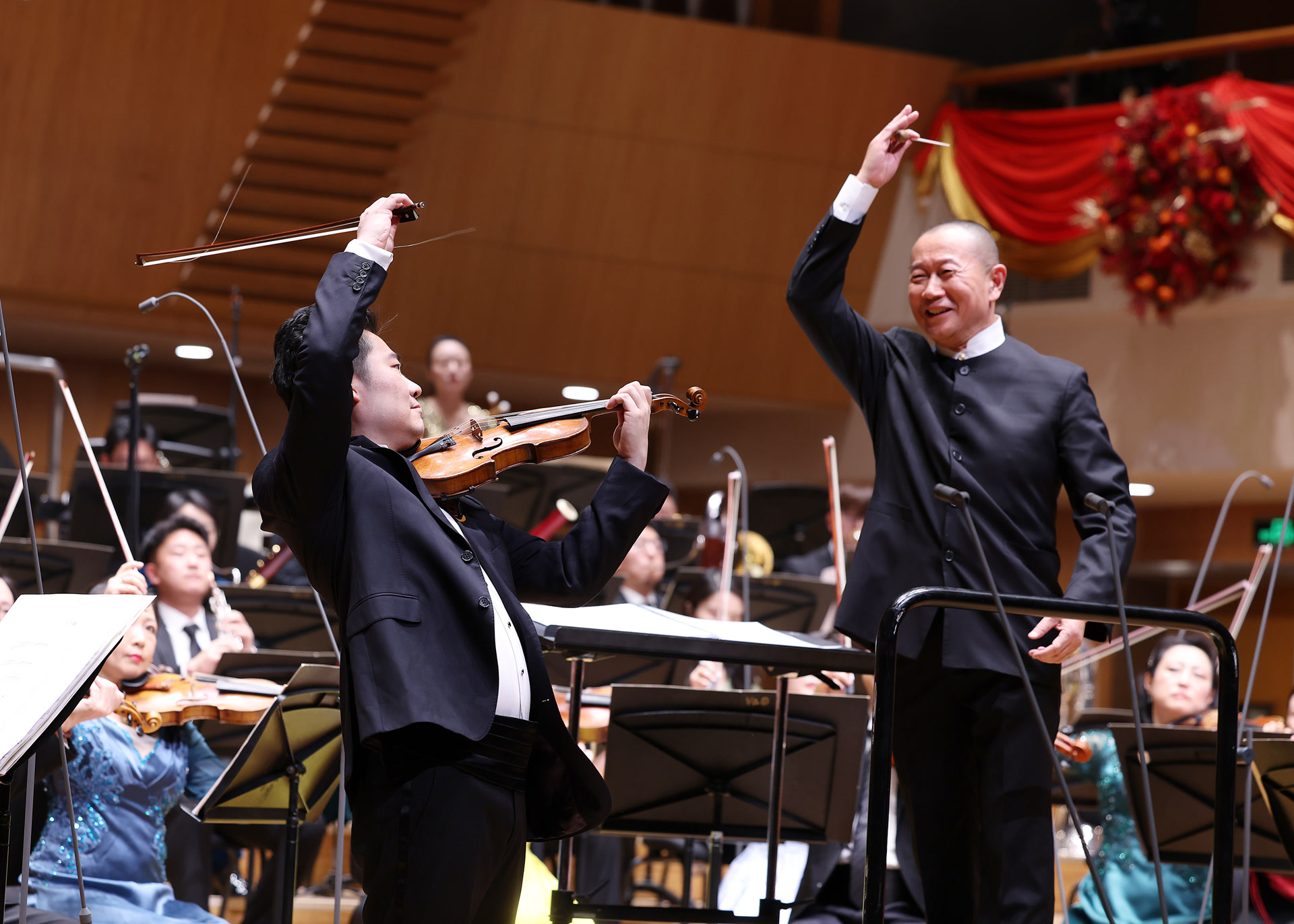开演钟声敲响,被鲜花彩缎装点一新的北京音乐厅里,中国交响乐团的乐手们鱼贯而入。与平时不同,女演奏家几乎全部换下庄重的黑色礼服,斑斓色彩映着渐渐明亮的场灯,在她们的长裙上明快流淌——12月27日晚,中国交响乐团由荣誉艺术指导、著名作曲家谭盾执棒,把新年将至的祝福、中国当代交响乐的发展浓缩在2026新年音乐会的丰富曲目里。