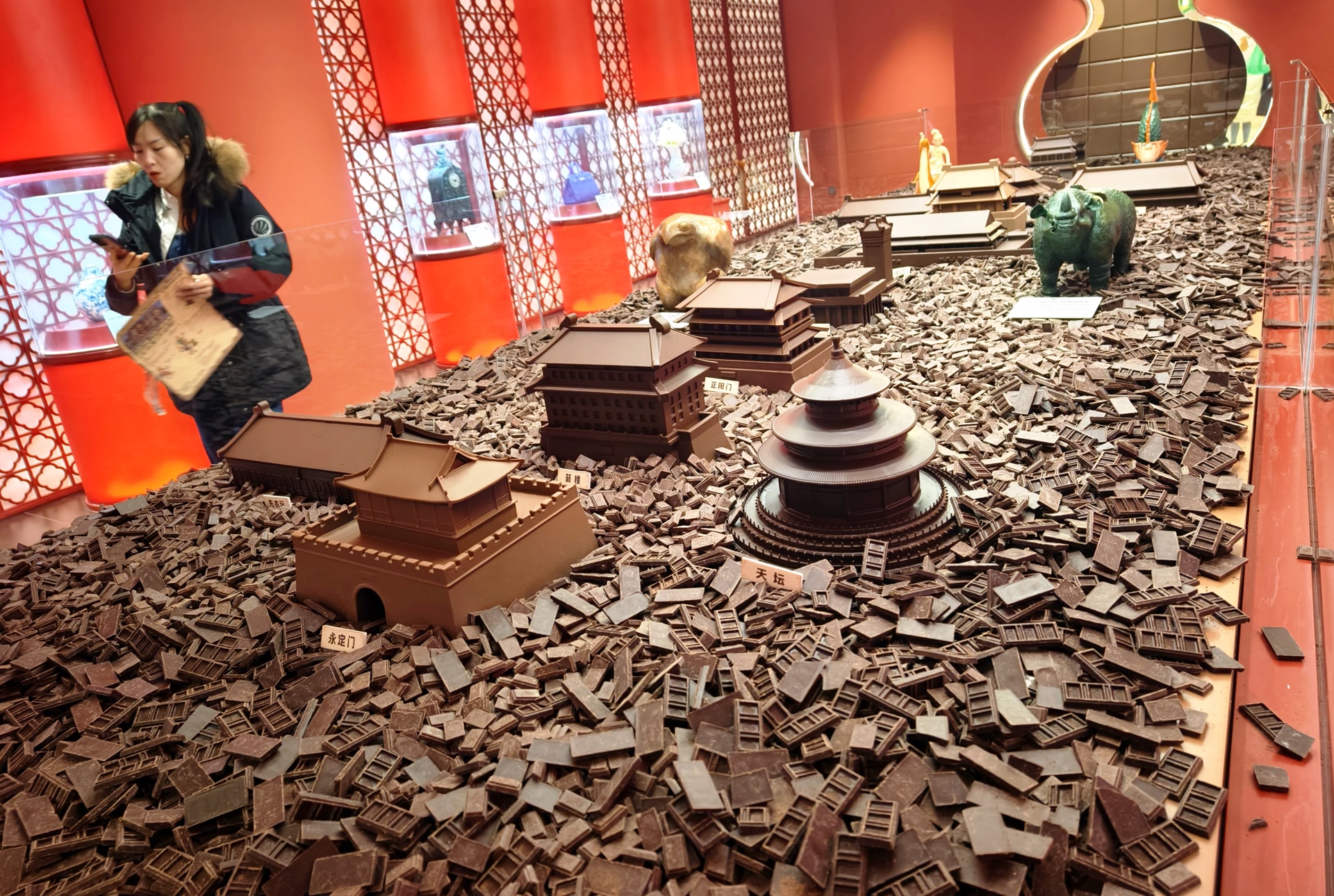 在巧克力艺术品展区,陈列着巧克力工艺师用以吨计量的巧克力创作的大型巧克力艺术品:黑白巧克力搭建的中国龙和长城活灵活现;巧克力北京城、巧克力中轴线、巧克力盘龙藻井等以北京人文风貌为灵感的展品彰显古都文脉。在此,巧克力不再只是食材,它是制作艺术品的材料和文化表达的载体。
