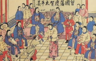 《曾国藩庆贺太平宴》,清末年画。正中榻上坐着李鸿章(左)和曾国藩(右),左边从左至右依次为左宗棠、骆秉章,右边坐着彭玉麟、曾国荃等湘军统帅。