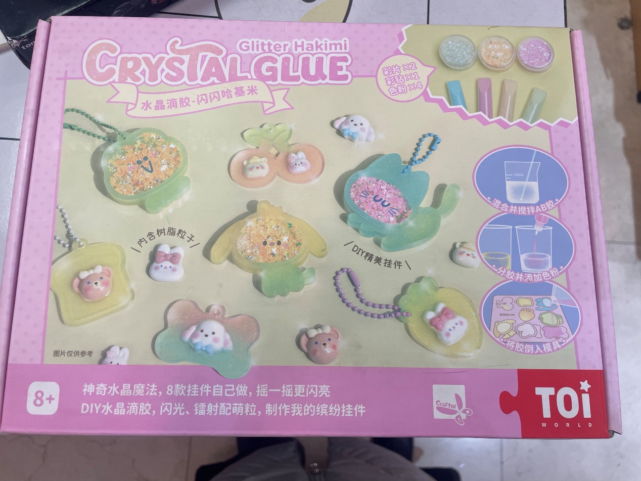 尽管李莎认为使用滴胶手工不适合孩子制作,但记者调查发现,目前市面上有不少“滴胶DIY手工套装”,包装做得五颜六色,模具形象也颇为卡通,显然是面向孩子设计的。在一家文具店,记者看到的一款手工套装产品就是如此,包装上还写着“适龄8岁以上”。