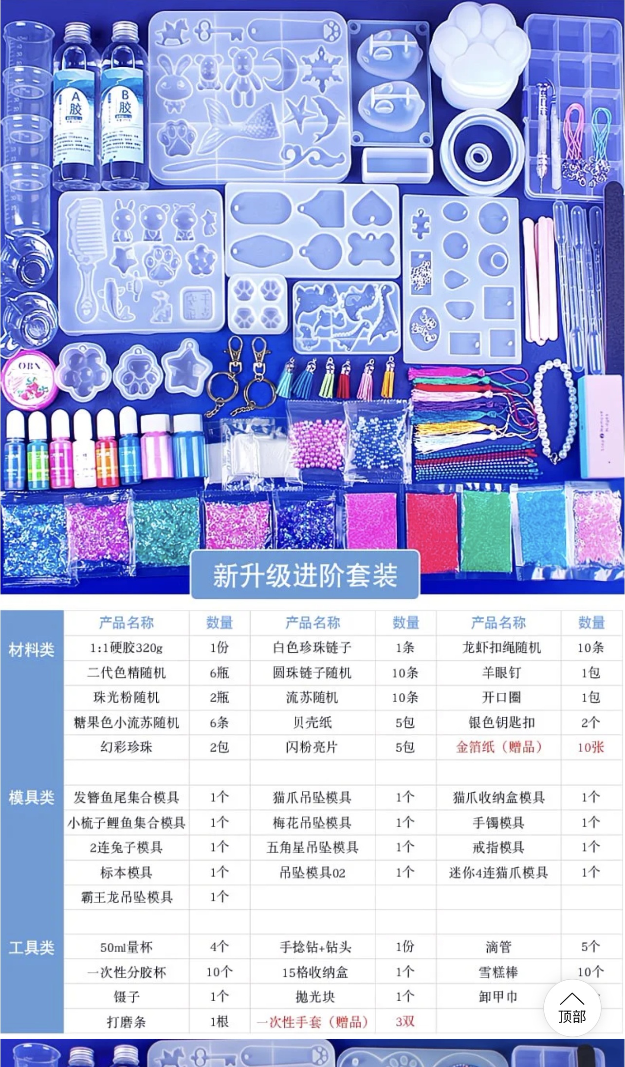 而在网购平台,这种diy手工套装就更多了,涵盖了滴胶、流麻、捏捏等多个手工品类。产品的封面图往往看起来眼花缭乱,材料多到数不清,但其中的核心还是AB胶、UV胶等胶水。