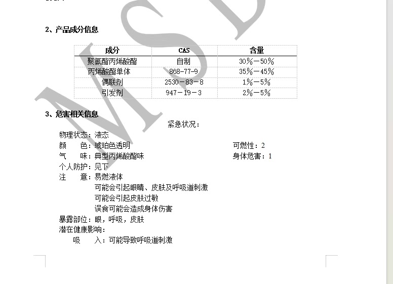 另外的一些商家,记者要求对方提供检测报告,但对方发来的东西“驴唇不对马嘴”。有的是“货物运输条件鉴定书”,证明这种产品在运输中不存在危险。还有的是产品成分信息表,也没有挥发物质的检测项,只有一栏“危险相关信息”,其中提到了“潜在健康影响,吸入:可能导致呼吸道刺激”。