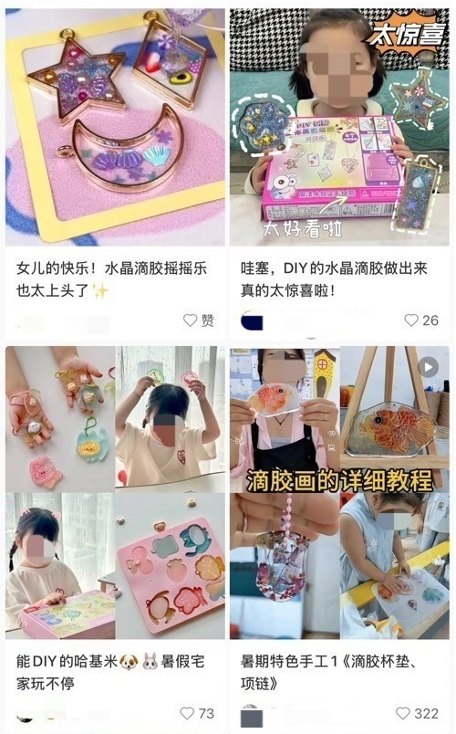 记者在社交平台上,找到了不少分享孩子如何做滴胶的图文和视频,内容大多是在记录孩子玩滴胶有多么开心,过程如何能锻炼动手能力,成品有多么好看,但没有一条提到了滴胶可能带来的危险以及制作时需要防护。由此看来,王晗对风险的预估不足,确实情有可原。